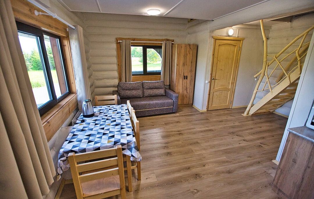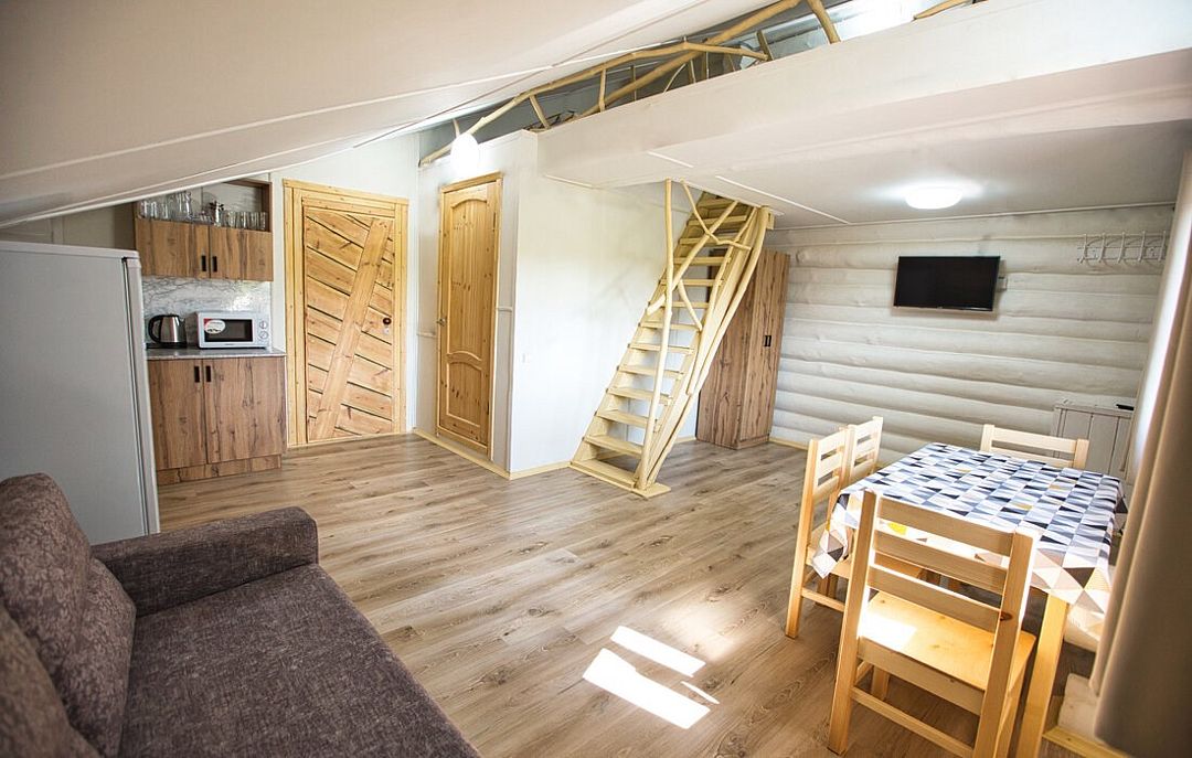 Первый этаж вместил в себя кухню, гостиную, душевую и санузел. На кухне найдется вся необходимая техника и утварь, а в гостиной – спутниковое ТВ. Это прекрасный дом для поездки со своей семьёй или друзьями.