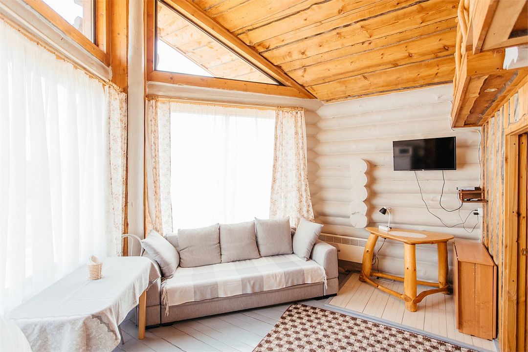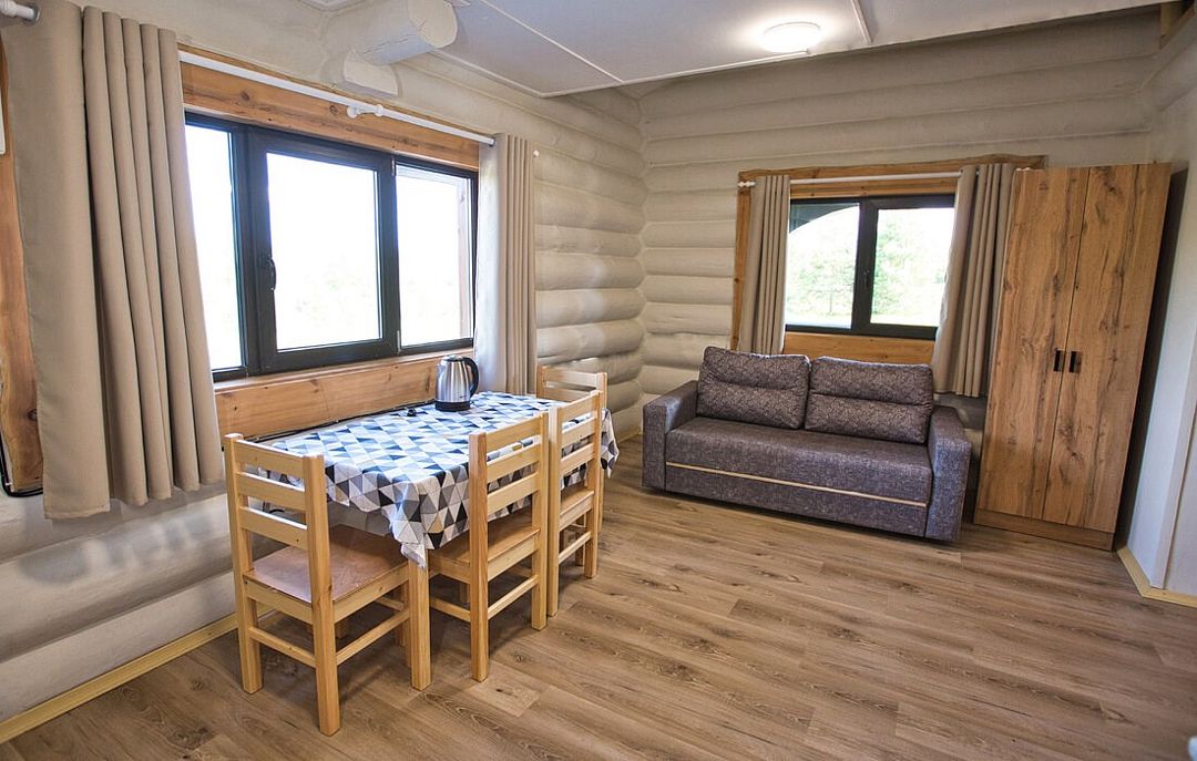 К вашим услугам деревянные коттеджи с мини-кухней, санузлом с душем и телевизором. Интерьеры оформлены в приятном деревенском стиле с использованием натурального дерева.