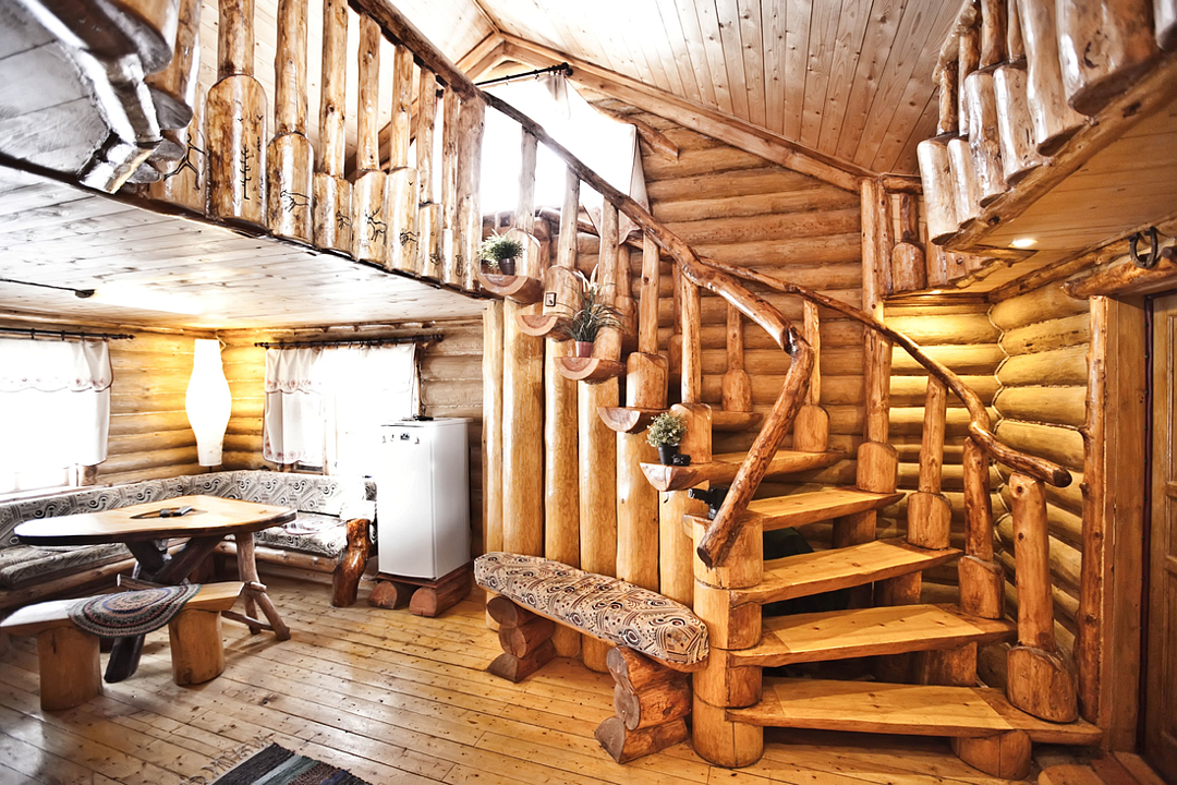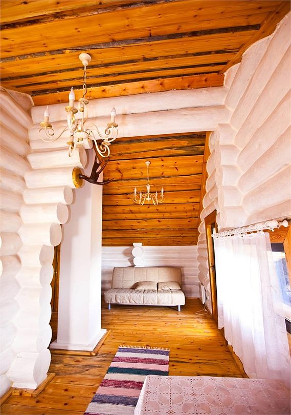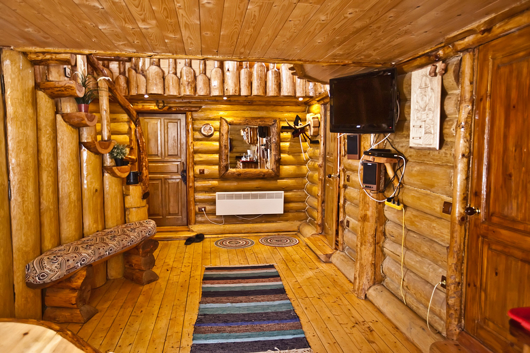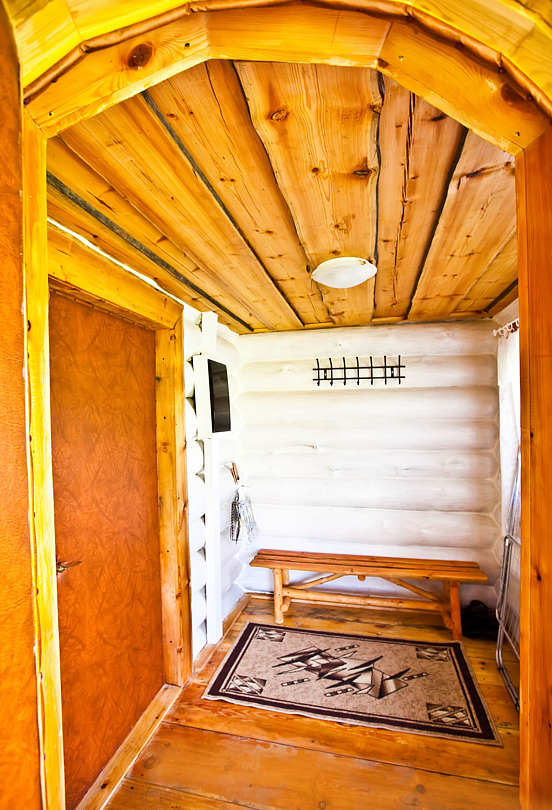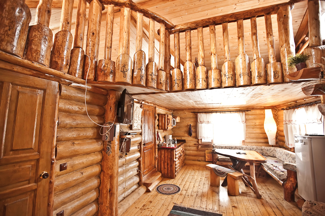 Изба «Солнечная» рассчитана на 8 человек. Два этажа деревянного сруба из карельской сосны спроектированы так, чтобы каждый гость чувствовал себя максимально удобно.