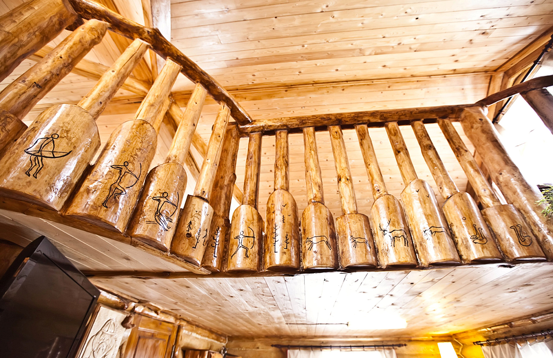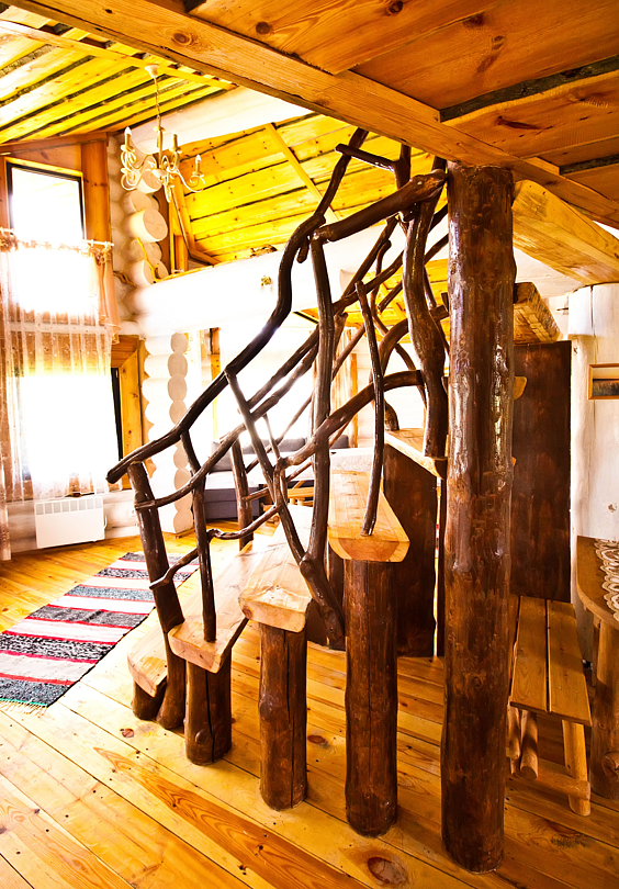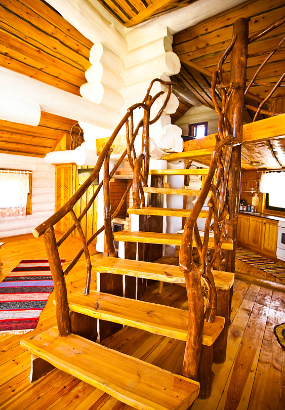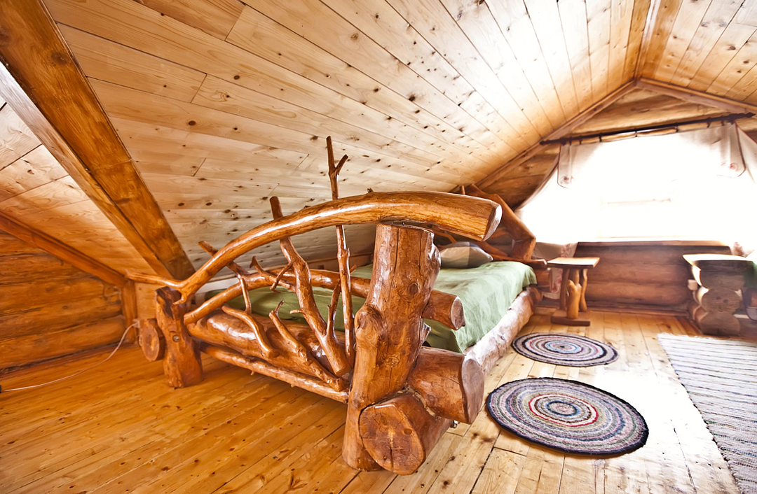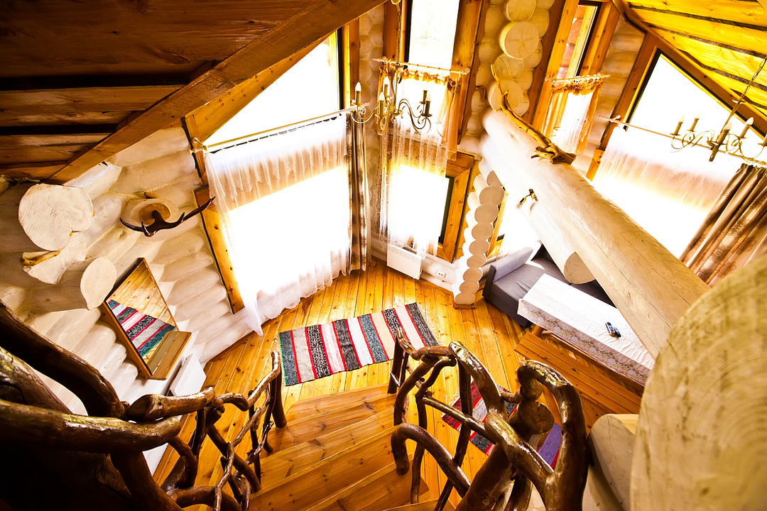 Изба «Солнечная» рассчитана на 8 человек. Два этажа деревянного сруба из карельской сосны спроектированы так, чтобы каждый гость чувствовал себя максимально удобно.