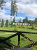 Деревянный дом из бруса. Полностью своя территория, только для этого дома. Территория огорожена забором. Дом стоит примерно посередине участка. Сам участок находится перед входом в лес. Внутренняя отделка дома из дерева.