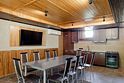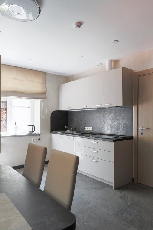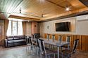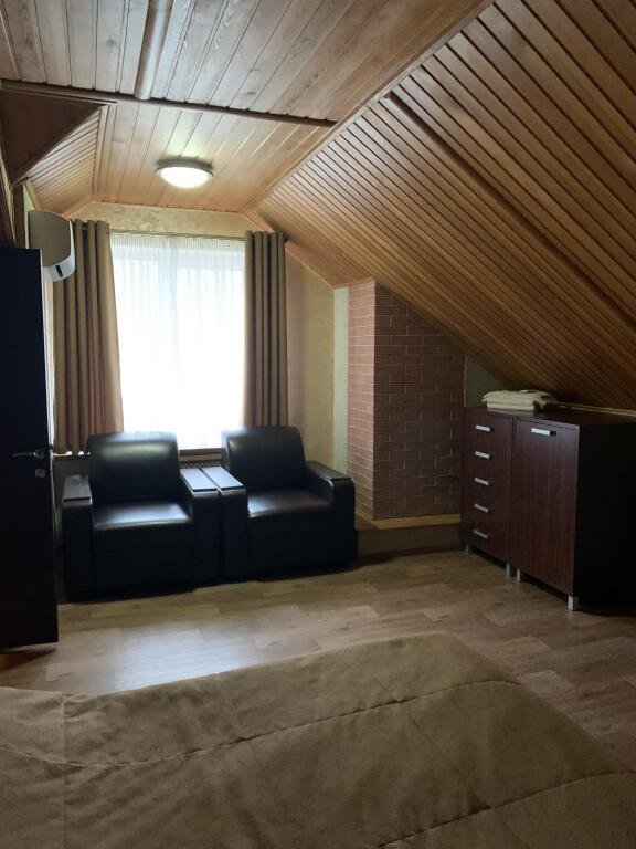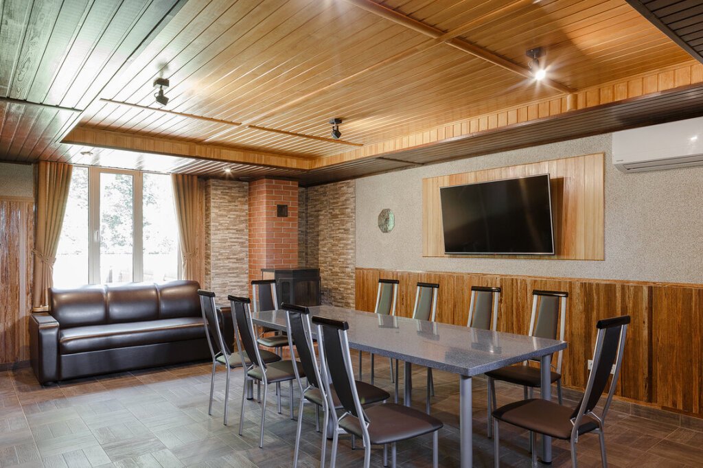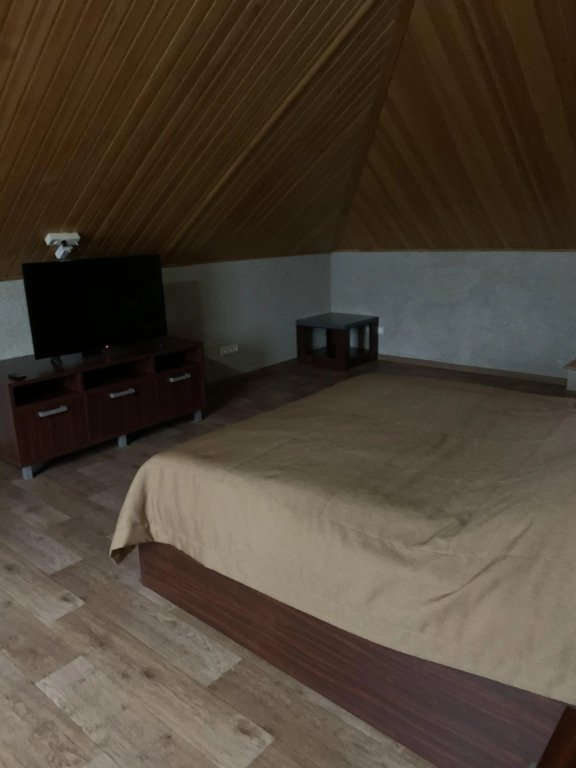 Прямо в коттедже находится баня на дровах (оплачивается дополнительно 1800 рублей час, заказ минимум 3 часа), ванная комната с туалетом, гостиная совмещенная с кухней. По центру гостиной большой обеденный стол, диван, напротив которого телевизор с цифровым сигналом — 20 эфирных каналов с идеальной картинкой. Кухня оборудована холодильником, микроволновой печью, чайником, набором посуды и столовых приборов.