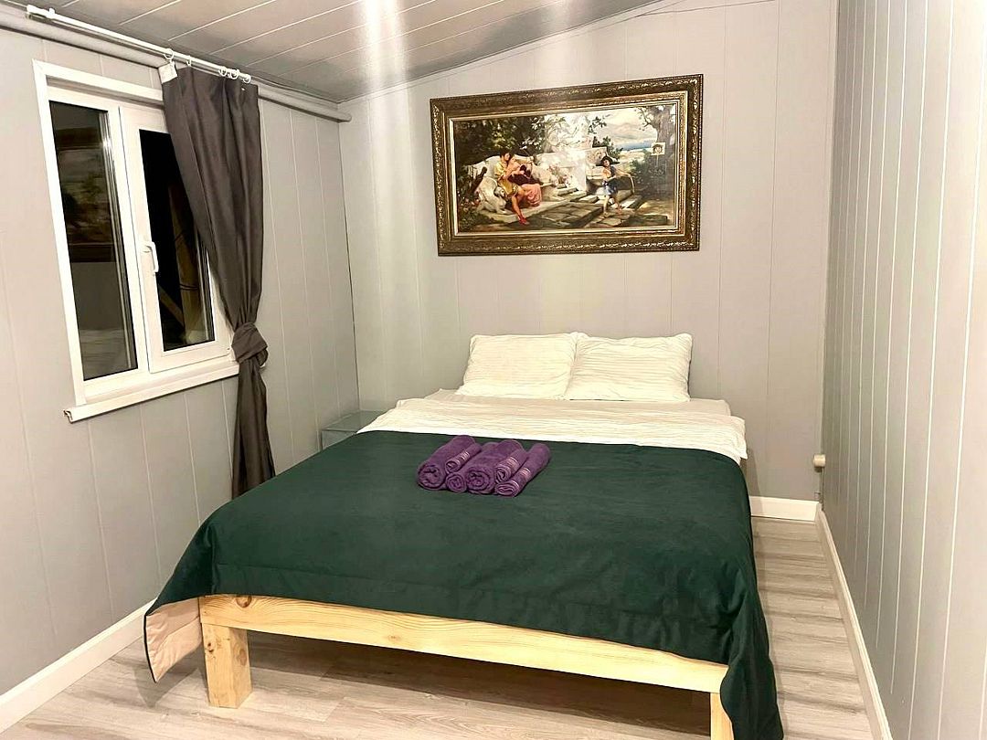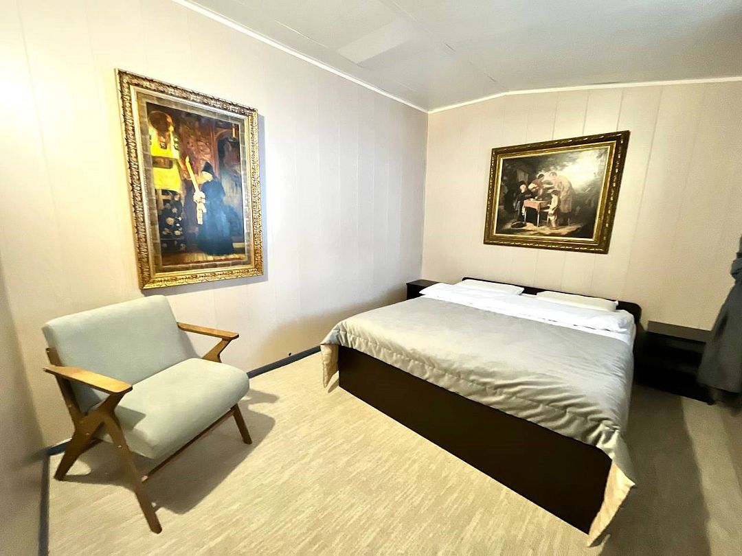 Однокомнатный номер на двух человек с одной двуспальной кроватью. Номер оборудован электричеством, водой, душем и туалетом.