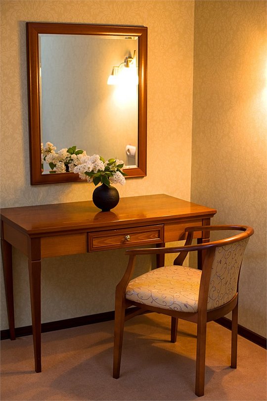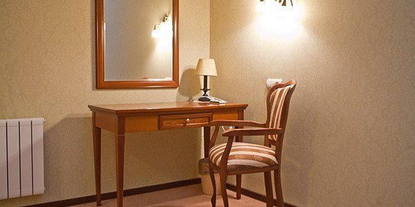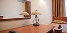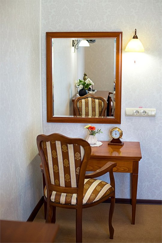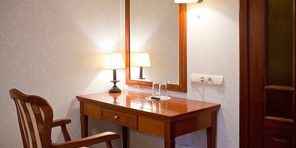 Просторный номер категории "Полулюкс" привлекает гостей высокими потолками и прекрасным окном с видом на город. В номере данной категории— кровать размера «King size» с ортопедическим матрасом, гипоаллергенное постельное белье, письменный стол, стулья, туалетный столик,телевизор с плоским экраном и большой диагональю, телефон, сейф, холодильник с мини-баром, электронные замки, ванная комната увеличенной площади с большой ванной, просторный шкаф для одежды. Тапочки, халат и набор полотенец для каждого гостя. Все создано для того, чтобы нашим гостям было удобно и комфортно. Номер для некурящих.Услуги и удобства