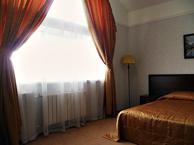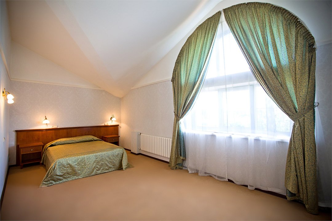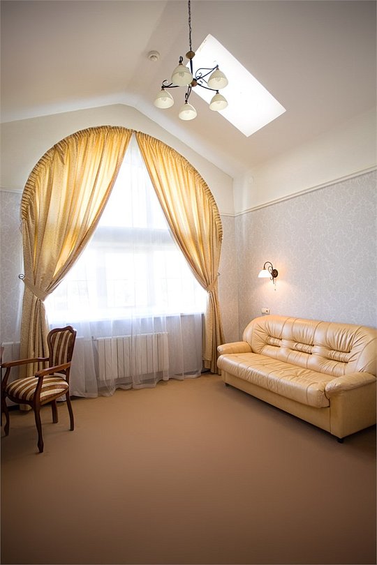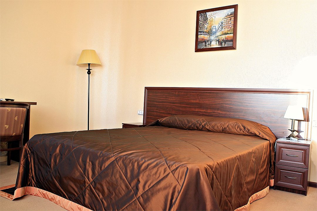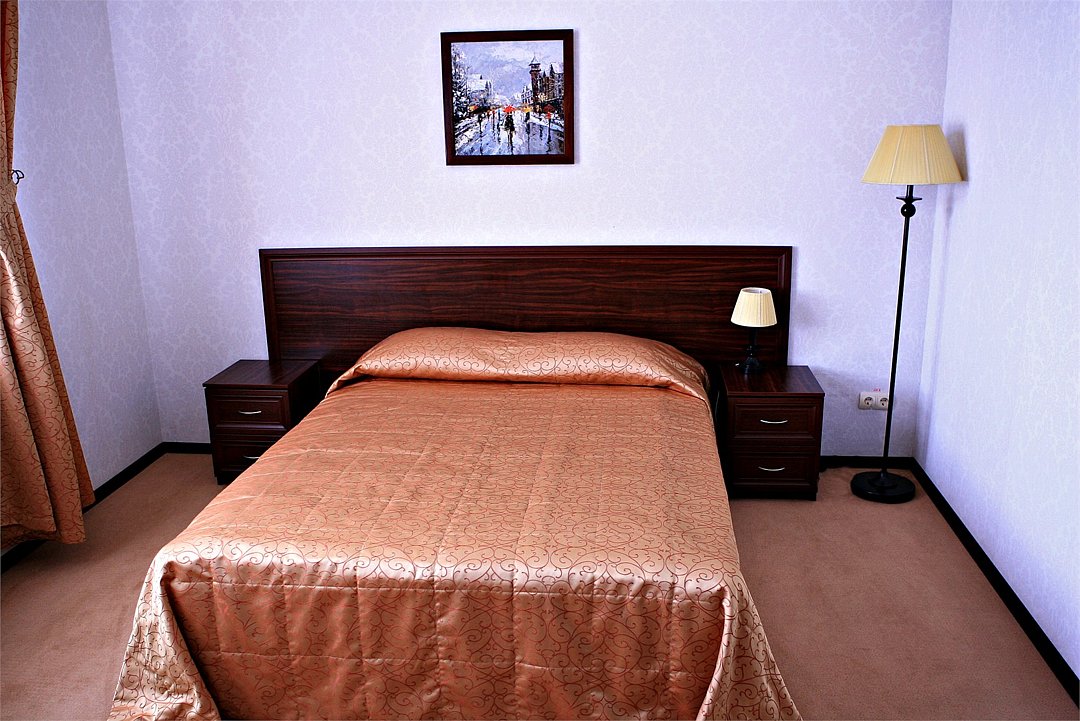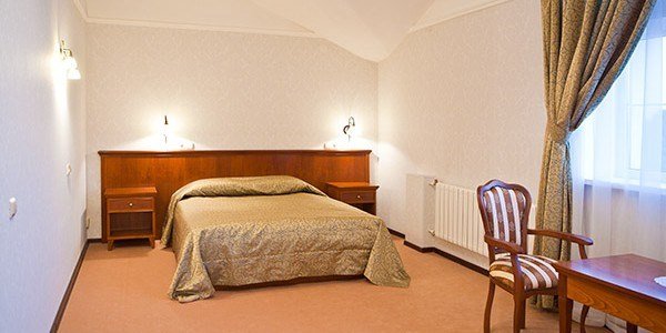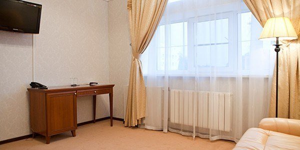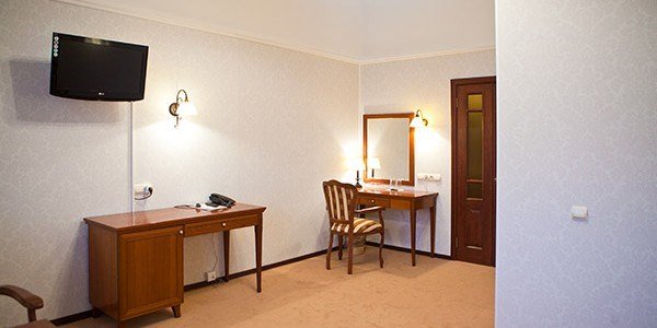 Номер категории "Люкс" предлагается для размещения до 3 персон, увеличенная площадь номера и две комнаты дарят ощущение простора и комфорта для каждого гостя. В первой комнате организованно место для отдыха, вторая комната подойдет в качестве кабинета со спальным местом в виде дивана-кровати. В номере — двухспальная кровать размера "king-size" с ортопедическим матрасом и анатомический диван-кровать, гипоаллергенное пастельное белье, письменный стол, стулья, туалетный столик, холодильник с мини-баром, телевизор с плоским экраном и большой диагональю, телефон, просторная ванная комната с ванной, кондиционер, шкаф для одежды. Тапочки, халат и набор полотенец для каждого гостя. Все создано для того, чтобы нашим гостям было удобно и комфортно. Номер для некурящих.Услуги и удобства