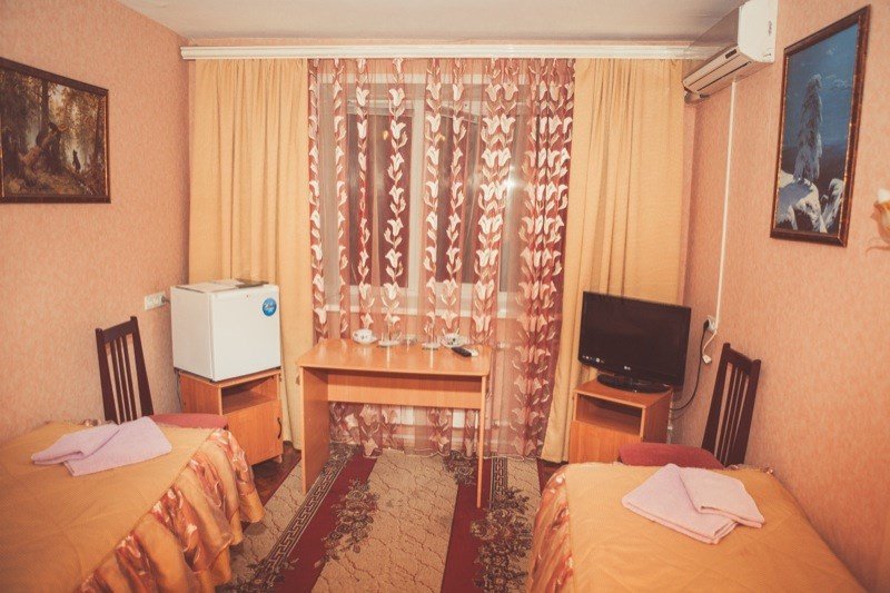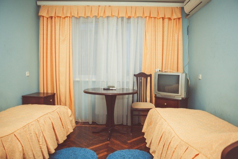 Две раздельные кровати 90х2000, стол, 2 стула, шкаф, 2 прикроватные тумбочки, кабельное телевидение, кондиционер, телефонная связь( международная, междугородная и внутренняя), раковина с горячей и холодной водой. Гипоаллергенные постельные принадлежности. Белье из хлопка, махровые полотенца. Душ и туалет бесплатно на этаже.Услуги и удобства