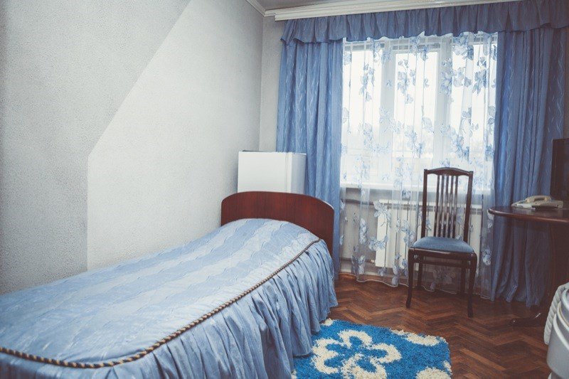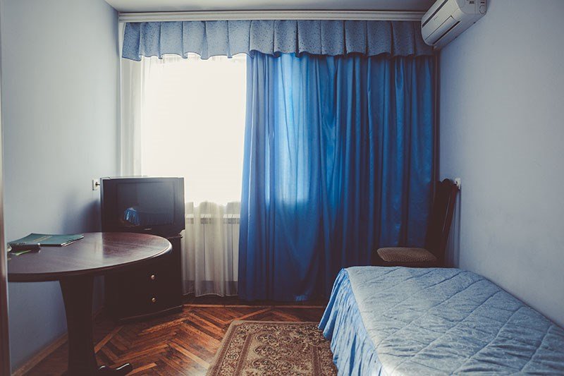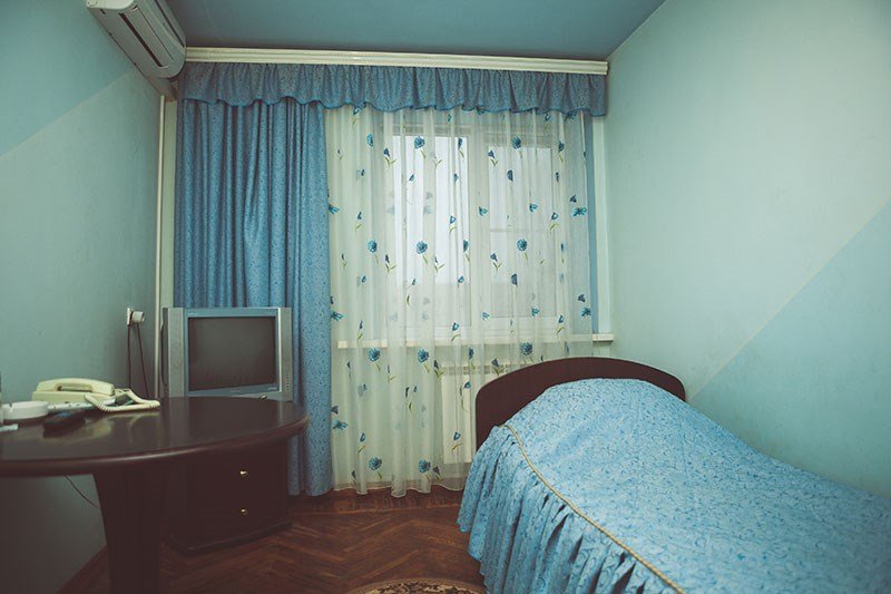 Одна кровать 90х2000, стол, стул шкаф, прикроватная тумбочка ,кабельное телевидение, кондиционер, телефонная связь( международная, междугородная и внутренняя), раковина с горячей и холодной водой, туалет. Гипоаллергенные постельные принадлежности. Белье из хлопка, махровые полотенца. Душ бесплатно на этаже.Услуги и удобства