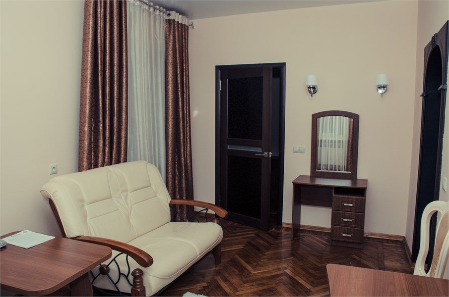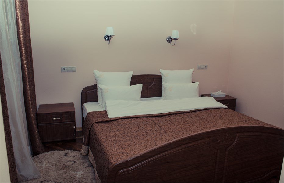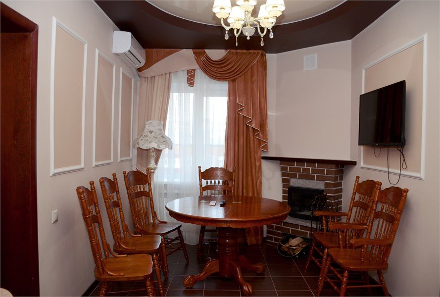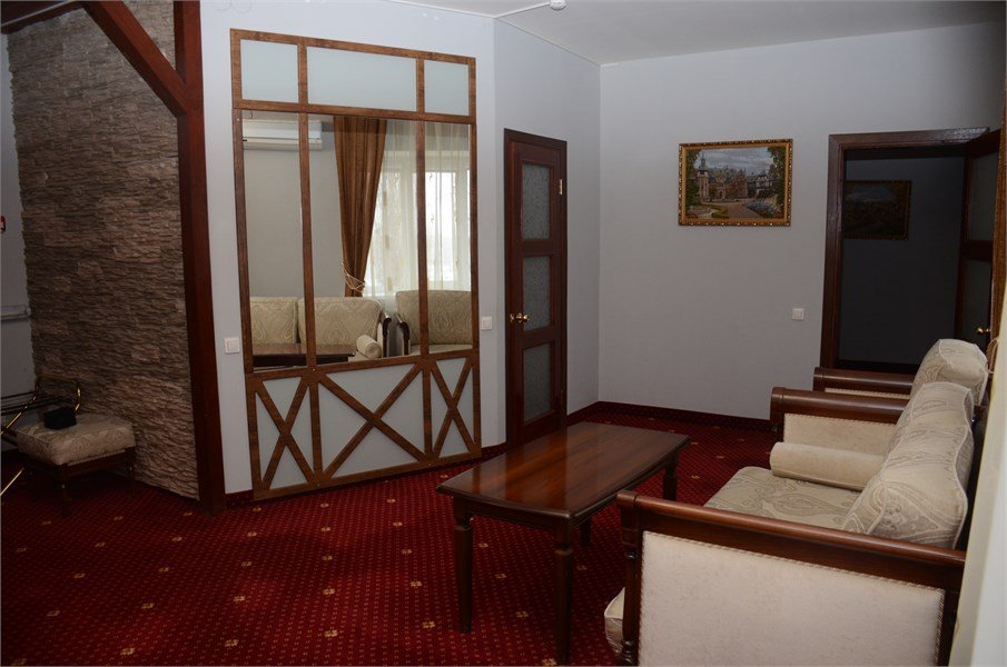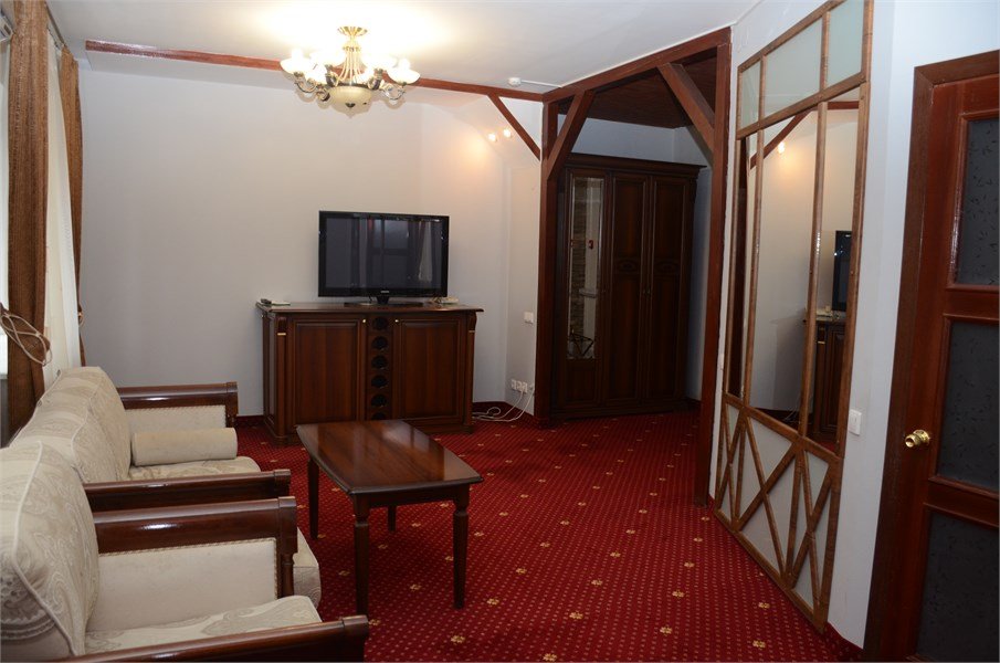 В номере 3 комнаты: спальня, кухня со столовой, рабочий кабинет, прихожая и 2 сан.узла ( один из которых гостевой). В спальне расположена одна кровать 1800х2000, две прикроватные тумбочки, телевизор с подключенным кабельным телевидением. .Гипоаллергенные постельные принадлежности. Белье из хлопка На кухне: кухонная мебель, индукционная панель, печь СВЧ, встроенный холодильник, необходимый набор посуды. В столовой: настоящий камин, стол со стульями, телевизор с подключенным кабельным телевидением. В рабочем кабинете: письменный стол, кресло руководителя, мягкое кожаное кресло для отдыха, телевизор с функцией 3 – D. Телефонная связь международная, междугородная и внутрення. В прихожей: шкафы для одежды, полка для багажа, мини- сейф. В ванной комнате: ванна, умывальник, туалет. Одноразовая косметика, махровые косметические салфетки, махровые халаты, махровые тапочки, фен, косметическое зеркало, махровый коврик для ног. Махровые полотенца. В номере ковровое покрытие пола.Услуги и удобства