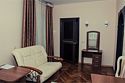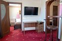 Одна кровать 1800х2000, две прикроватные тумбочки, сейф, стол, диван, кресло, шкаф - прихожая ,кабельное телевидение , кондиционер, телефонная связь( международная, междугородная и внутренняя),джакузи, туалет. Одноразовая косметика, махровые косметические салфетки, махровые халаты, махровые тапочки, фен, косметическое зеркало, махровый коврик для ног. Гипоаллергенные постельные принадлежности. Белье из хлопка, махровые полотенца.Услуги и удобства
