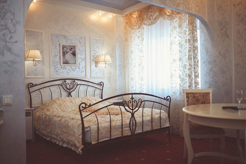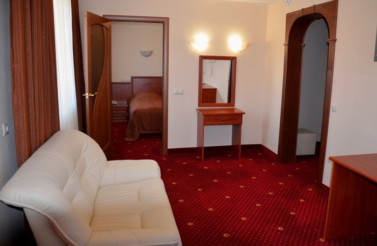 Одна кровать 1800х2000, две прикроватные тумбочки, сейф, стол, диван, , шкаф - прихожая ,кабельное телевидение , кондиционер, телефонная связь( международная, междугородная и внутренняя),джакузи, душевая кабина, туалет. Одноразовая косметика, махровые косметические салфетки, махровые халаты, махровые тапочки, фен, косметическое зеркало, махровый коврик для ног. Гипоаллергенные постельные принадлежности. Белье из хлопка, махровые полотенца.Услуги и удобства