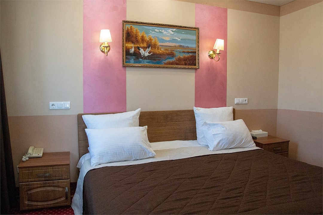 телевизор, кабельное телевидение, Wi-Fi, телефон, холодильник, кондиционер, светильник, фен, будильник, система безопасности, электронные замки, ванная комната, ванная с джакузи, халаты, тапочки, гигиенические средства, двуспальная кровать, гипоаллергенное белье, ортопедический матрас, тумбы, стулья, шкаф для одежды, обеденный стол, зеркало, обслуживание номеров, информационная карта, меню, унитаз, раковина, косметическое зеркало, питьевая вода, ковровое покрытие, отопление, вид на город, кулер на этажеВ номере