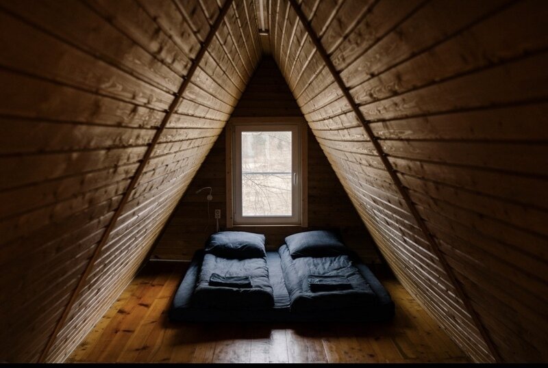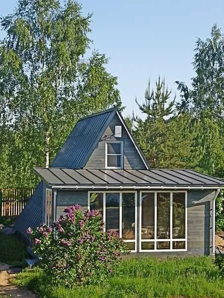 А-фрейм с большой закрытой верандой и 2-мя спальнями.