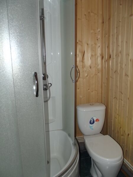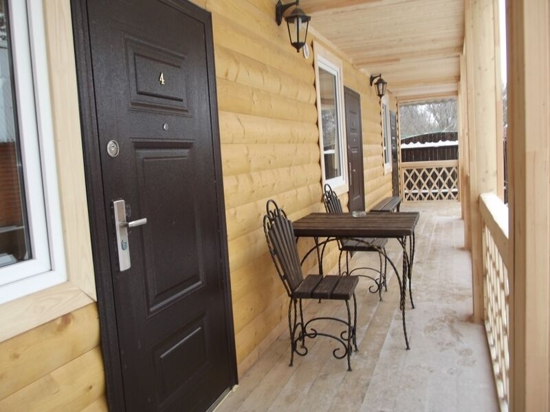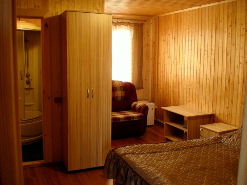 Первый этаж — 4-местный номер: гостиная, 2 спальни, санузел с душевой, предбанник, парная, открытая веранда. Гостиная: большой деревянный стол, угловой раскладной диван, ЖК TV со спутниковым телевидением, холодильник. Спальни: 2-х спальные кровати, шкафы, прикроватные тумбочки, бра. Санузел с душевой. Парная на дровах. Веранда — деревянный стол и скамейки