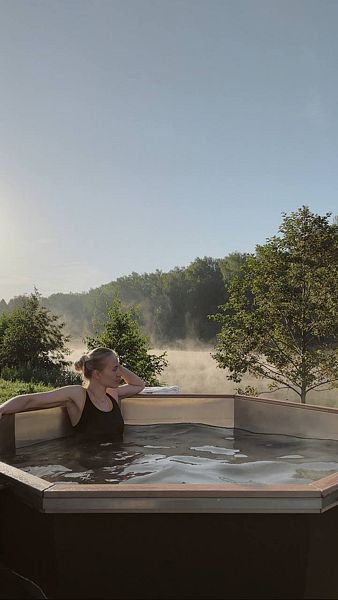Инфраструктура: чан, зона отдыха, обливное ведро, душБаня на дровах с панорамным видом на реку, купель большая терраса с навесом, пирс с 2 лежаками, туалет и душ, комната отдыха, чайник, фен, халаты, косметика и мангал, чан за дополнительную плату.