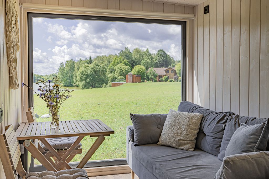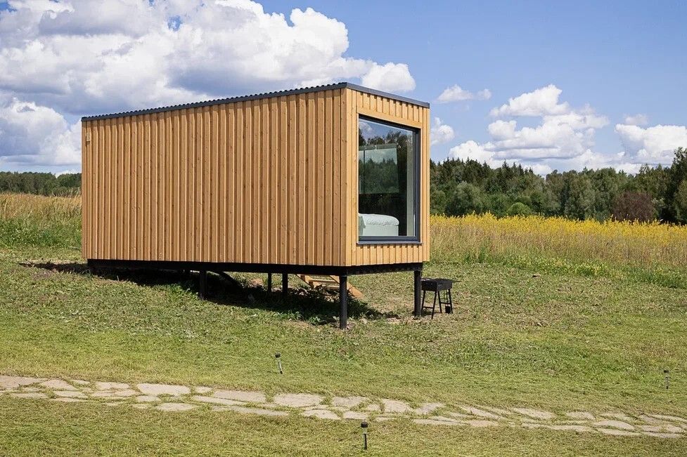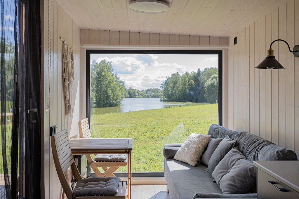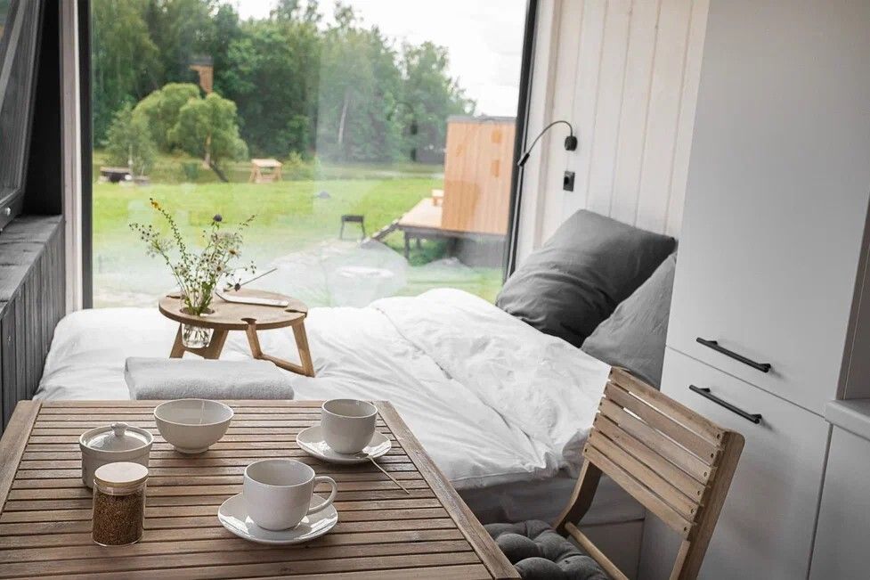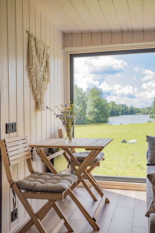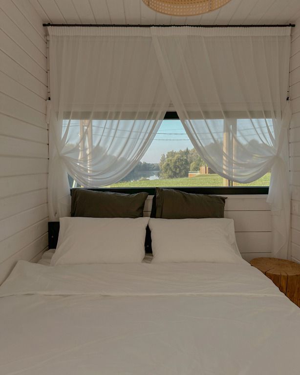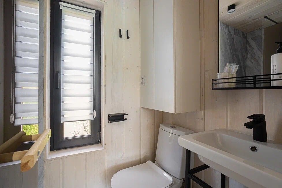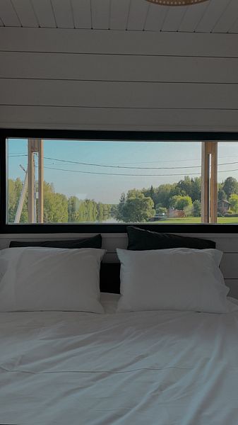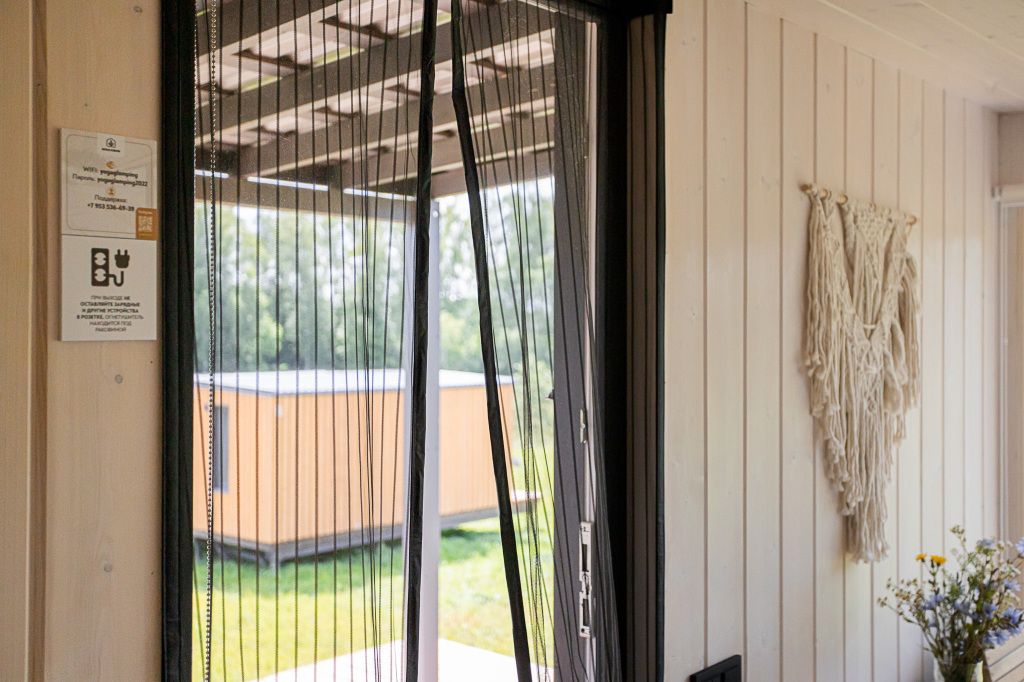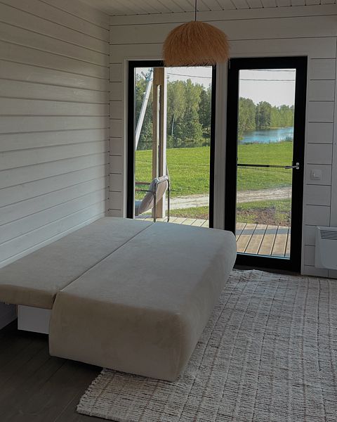 Домик расположен на берегу реки, которая берет начало прямо на территории глэмпинга! Из домика открывается панорамный шикарный вид на реку. В домике всегда тепло.