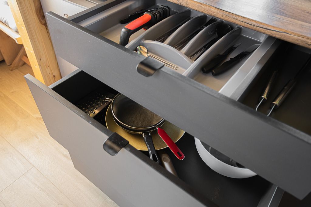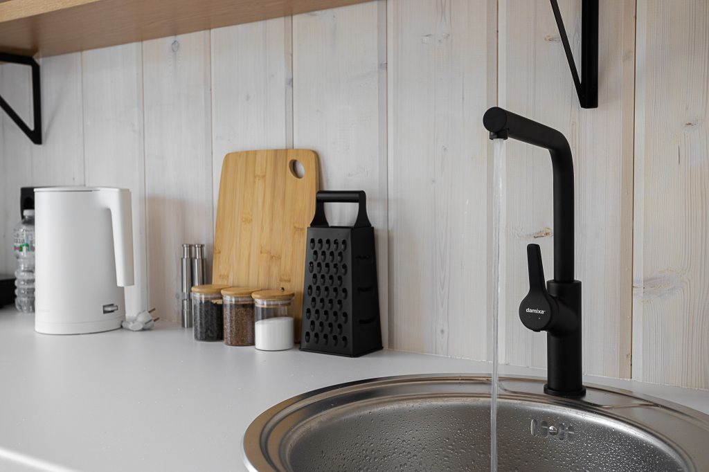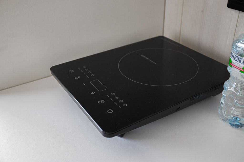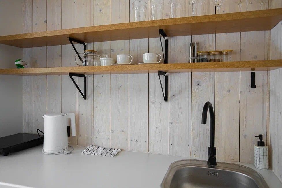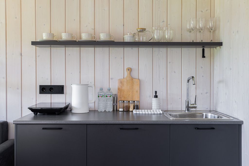 Кухонная зона полностью укомплектована всем нужным для самостоятельного приготовления еды: холодильником, электрическим чайником, обеденным столом и столовыми приборами. Также предоставляются бесплатные чай и кофе.