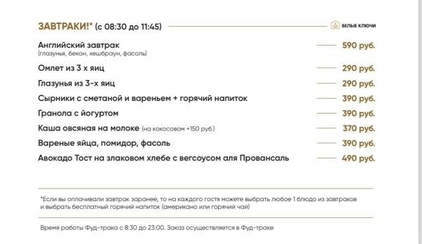 Вкусный завтрак на 1 гостя, можно выбрать с вечера на утро из меню 1 любой завтрак + горячий напиток.