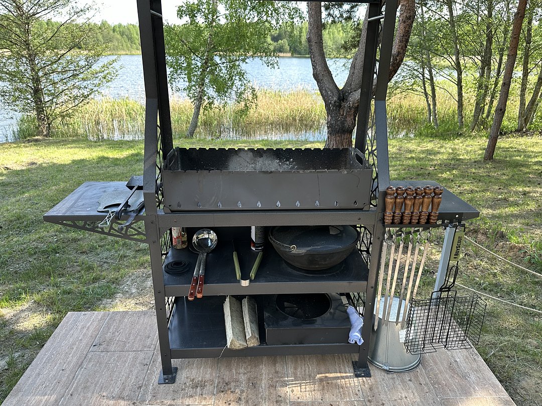 Загородный дом предлагает своим гостям уютную и полностью оборудованную кухню, идеально подходящую для приготовления домашних блюд. На свежем воздухе располагается специально отведенное место для мангала, где есть все необходимое для незабываемых встреч на природе.