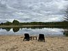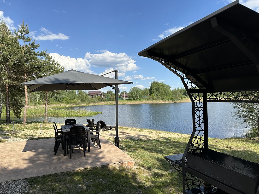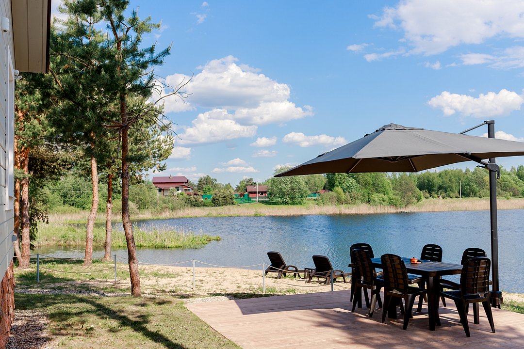 Открытая терраса с удобной мебелью для отдыха на свежем воздухе, откуда открывается красивый вид на озеро. Для защиты от солнца и легкого дождя предусмотрен зонтик.