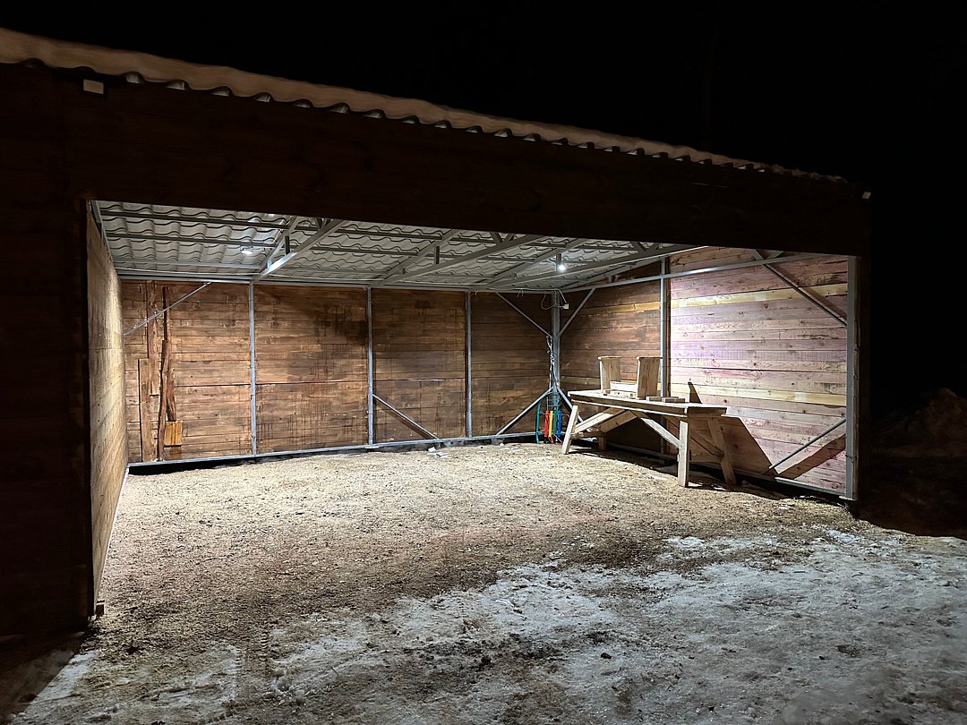 На территории загородного дома расположена автостоянка с навесом, предназначенная для двух машин. Такой навес обеспечивает надежную защиту автомобилей от погодных условий.