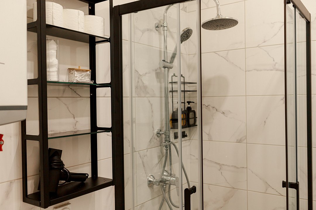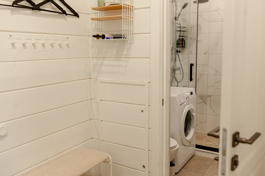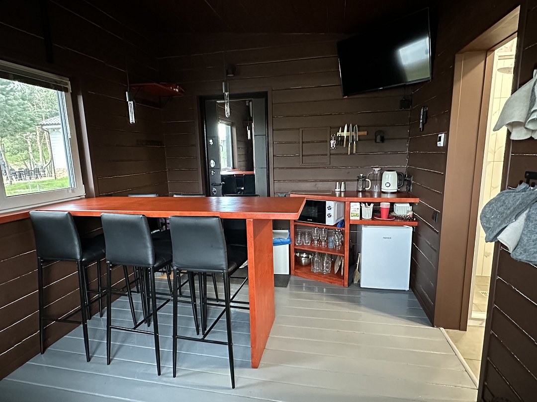 Для удобства гостей в бане есть душевая и санузел, предоставляются туалетно-косметические принадлежности, фен, микроволновая печь, холодильник, электрический чайник с чаем, доступ в интернет через Wi-Fi и Smart TV. Рядом находится мангальная зона и парковка для двух автомобилей.