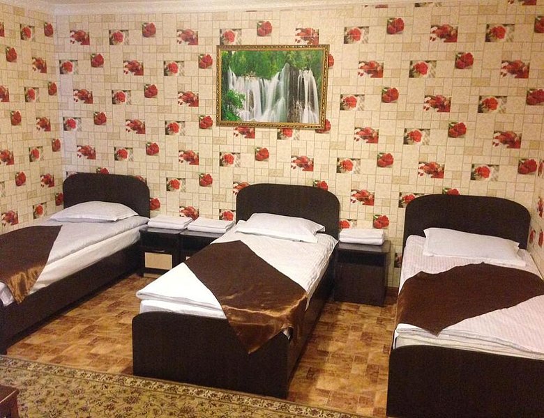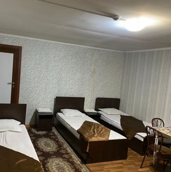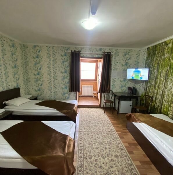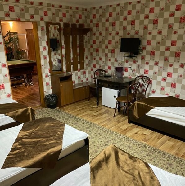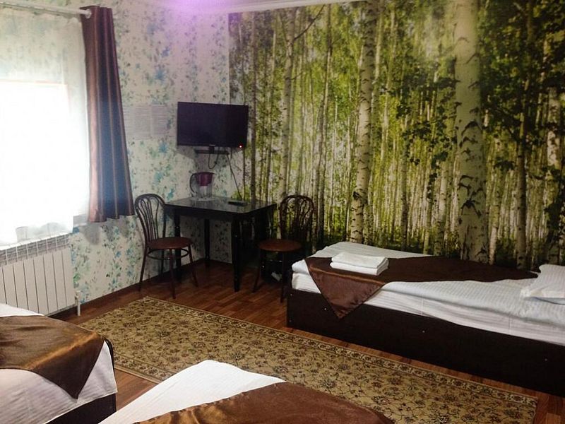 В номере: пять односпальных кроватей, фен, чайник, холодильник, телевизор. Собственная ванная комната.
