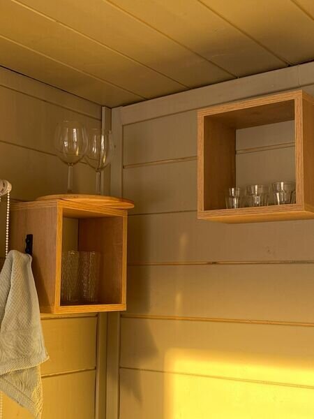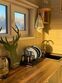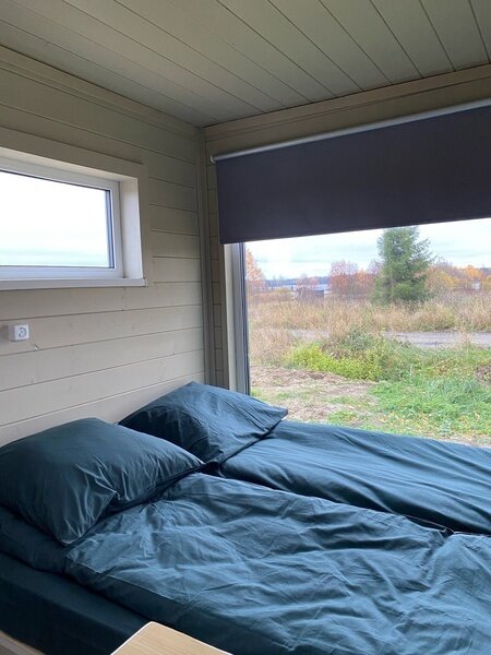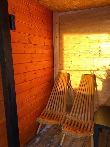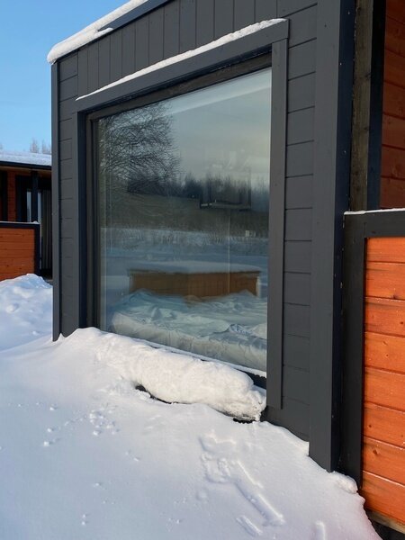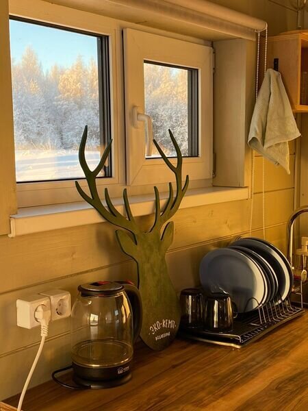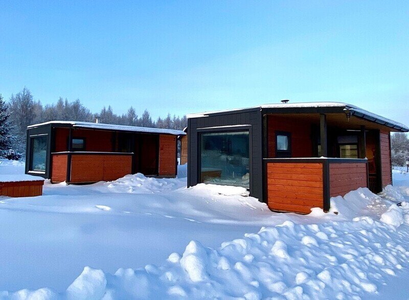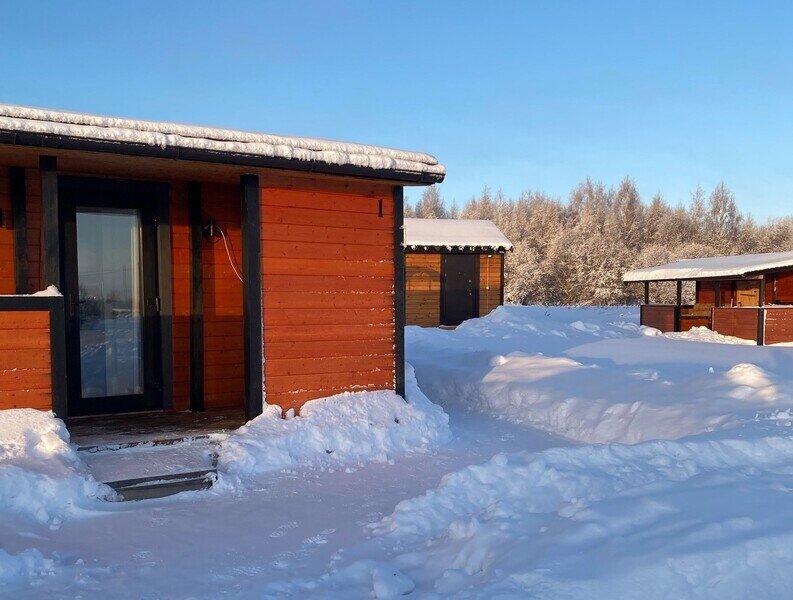 Здесь гостям предлагается остановиться в уютных эко-домиках со всем необходимым. Имеется большая удобная кровать-подиум, из которой через панорамное окно можно наблюдать удивительную природу этих мест. Чтобы не замерзнуть в холодные вечера, в домах установлены теплые полы и каркасные печи. Есть собственная ванная комната с новой сантехникой и горячей водой. А также телевизор и доступ к Wi-Fi.