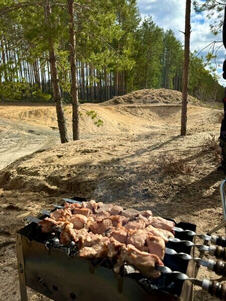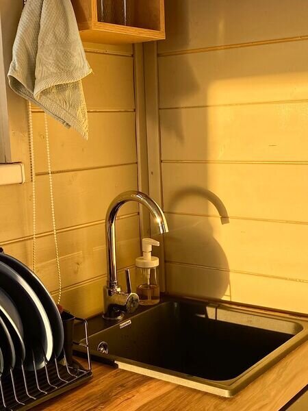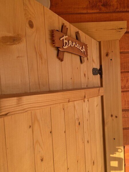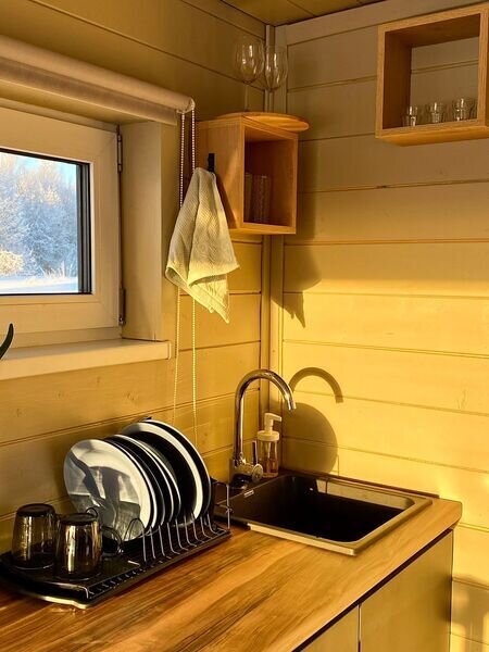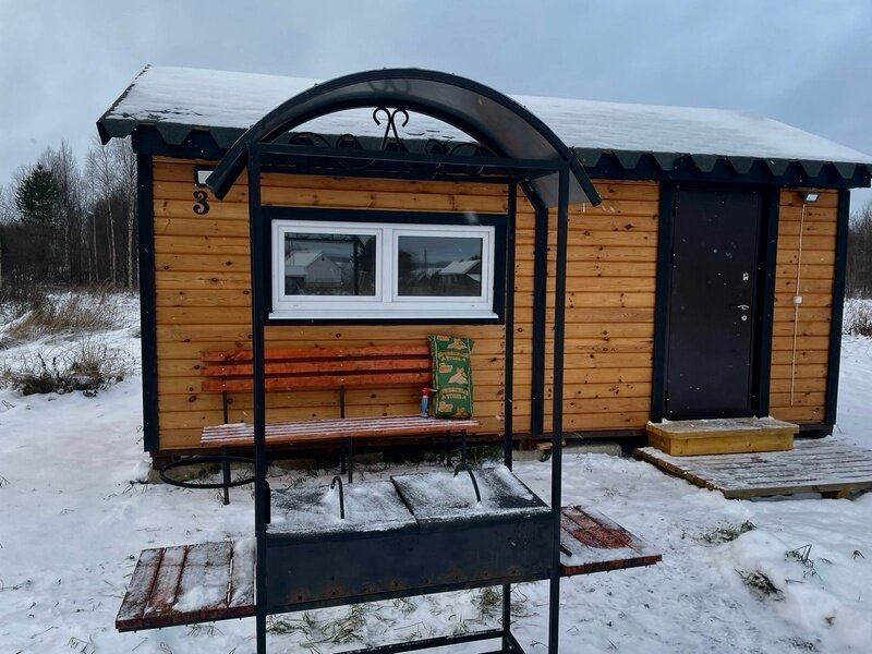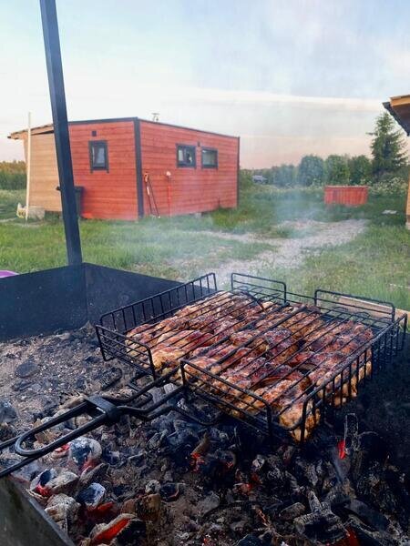 В домах оборудована кухонная зона с микроволновой печью, набором посуды и электрическим чайником. А на прилегающей территории имеется мангал, казан и коптильня.
