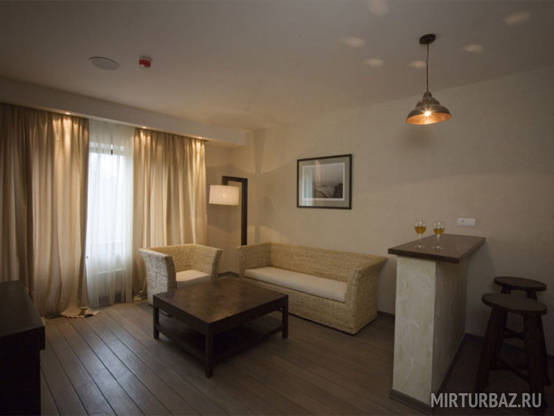 - В номере: гостиная с мягкой мебелью, холодильником, телевизором, барной стойкой и большая спальня;