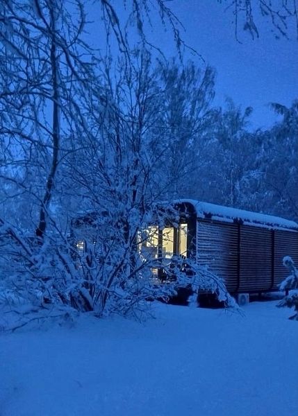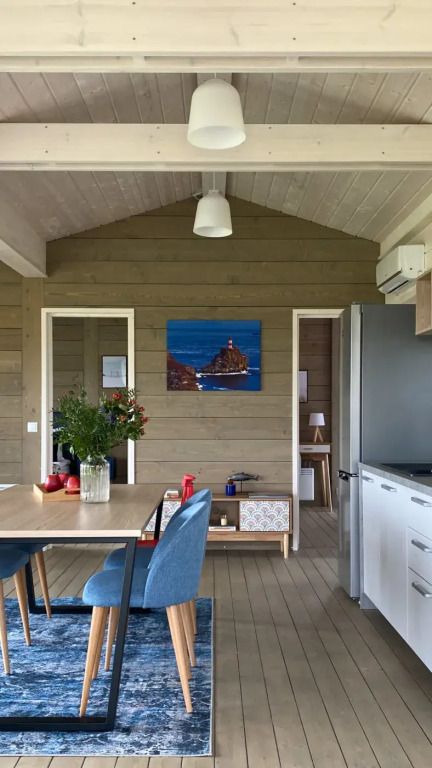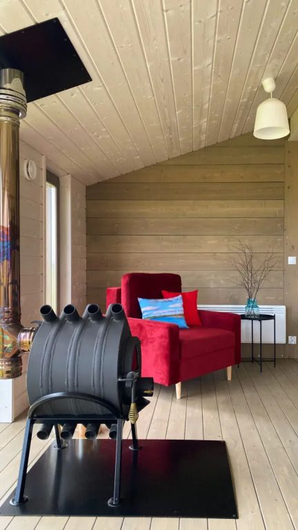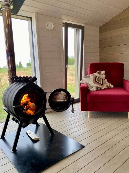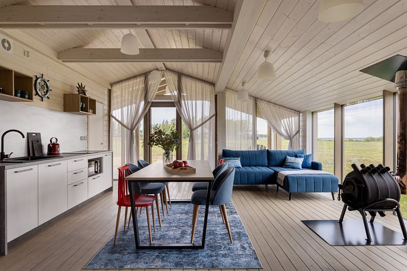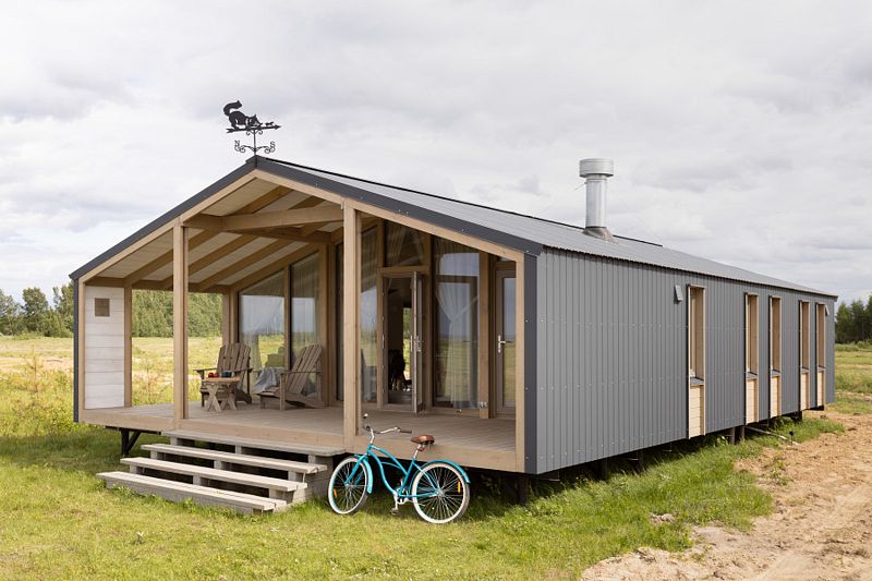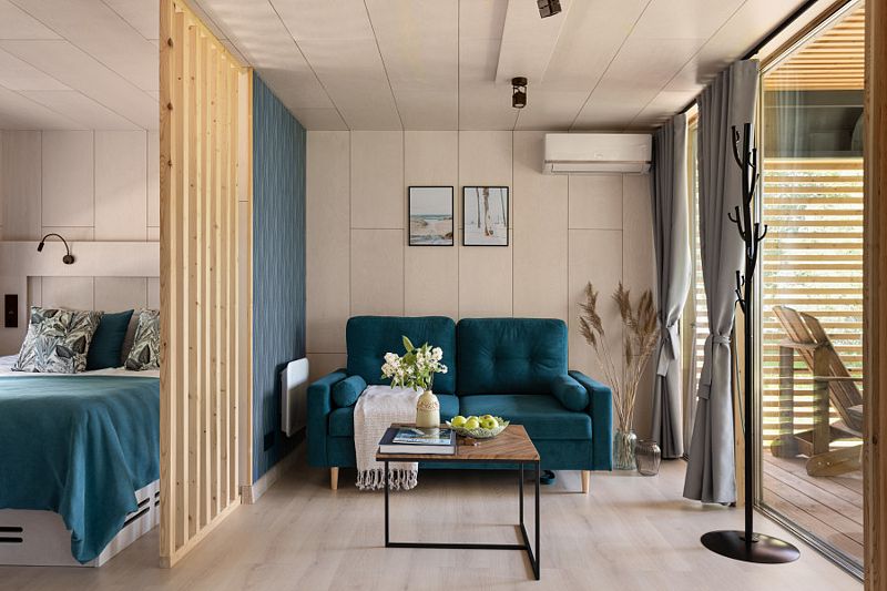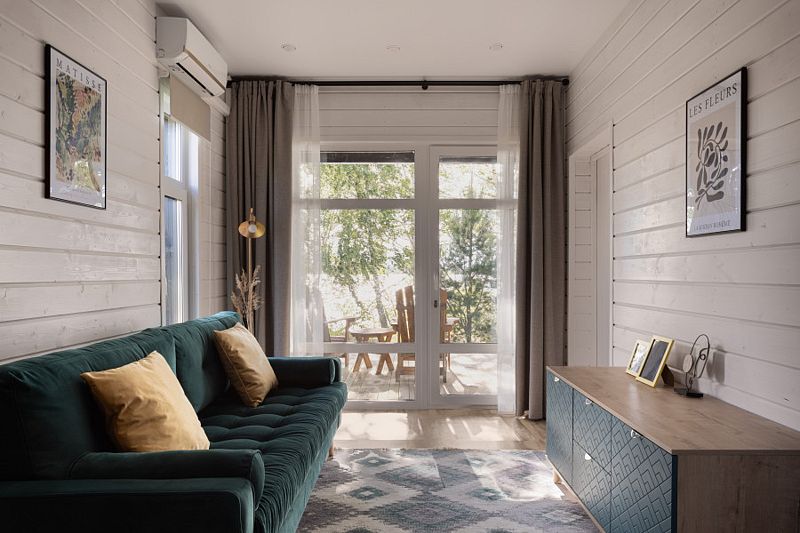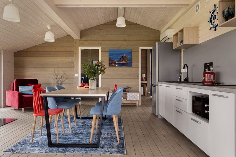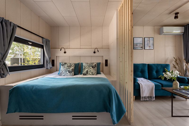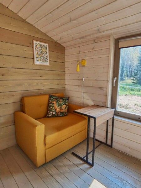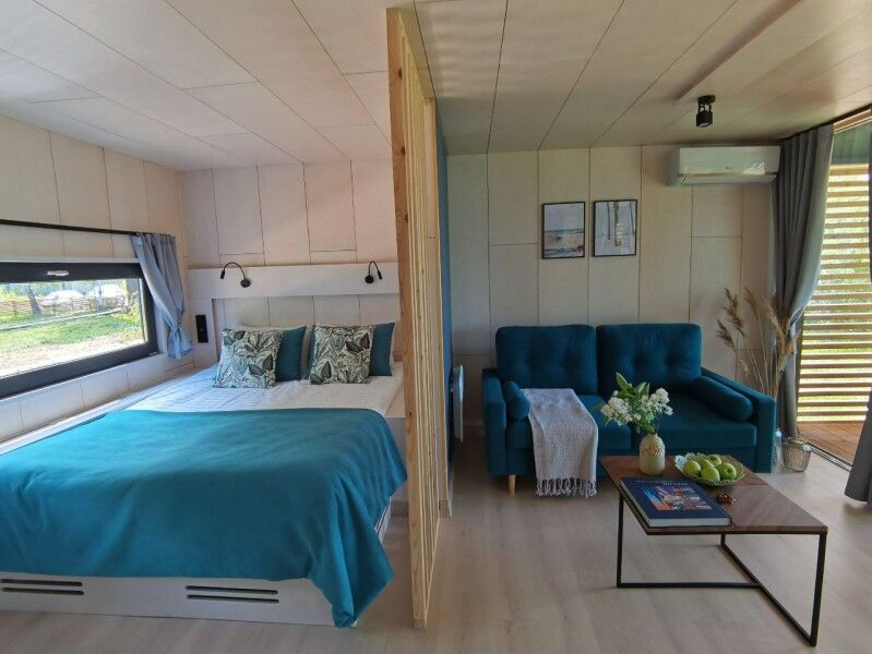 В этом небольшом, но очень уютном мини-коттедже отделка выполнена из экологичного натурального дерева. Внутреннее пространство разделено на спальню, гостиную и кухню.