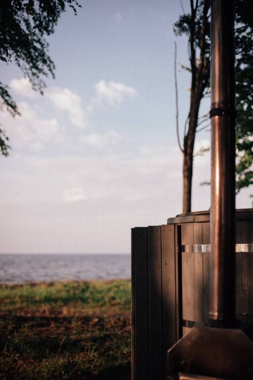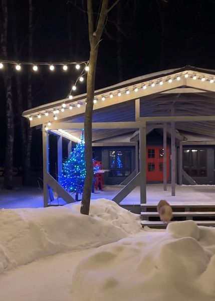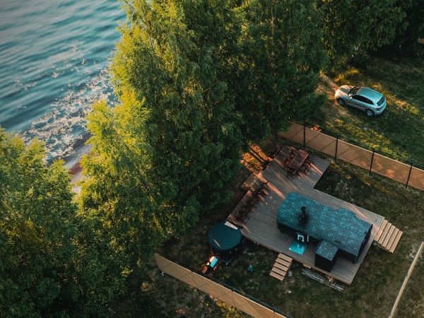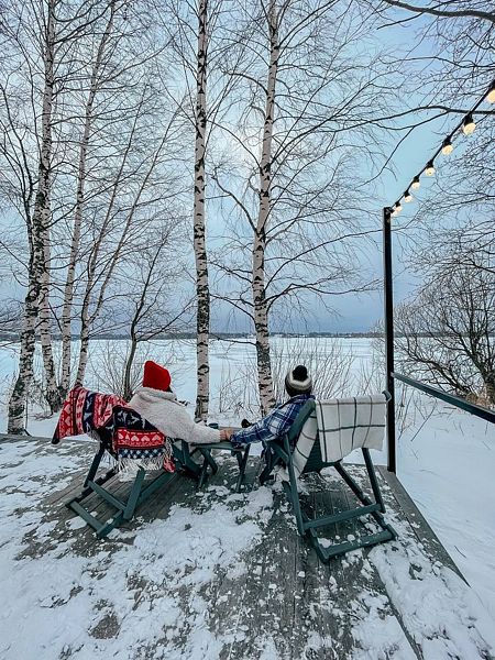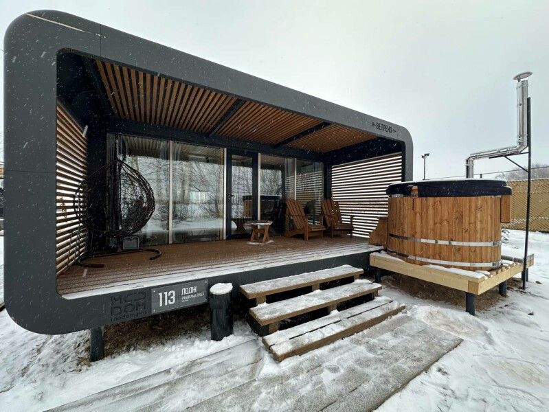 - банный комплекс на берегу реки: баня бочка с панорамным окном, подогреваемая купель фурако с аэромассажем и подсветкой, зона отдыха с мангалом, шезлонгами и обеденной зоной;
