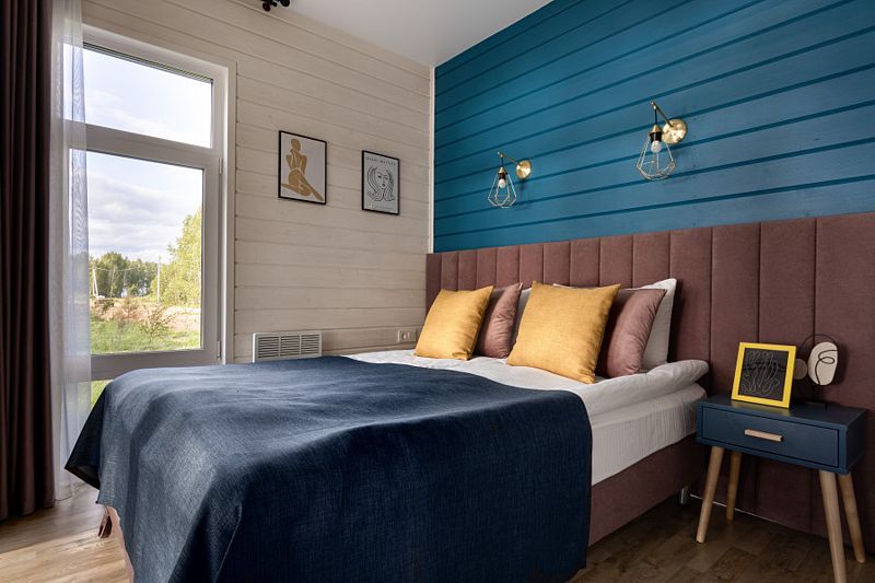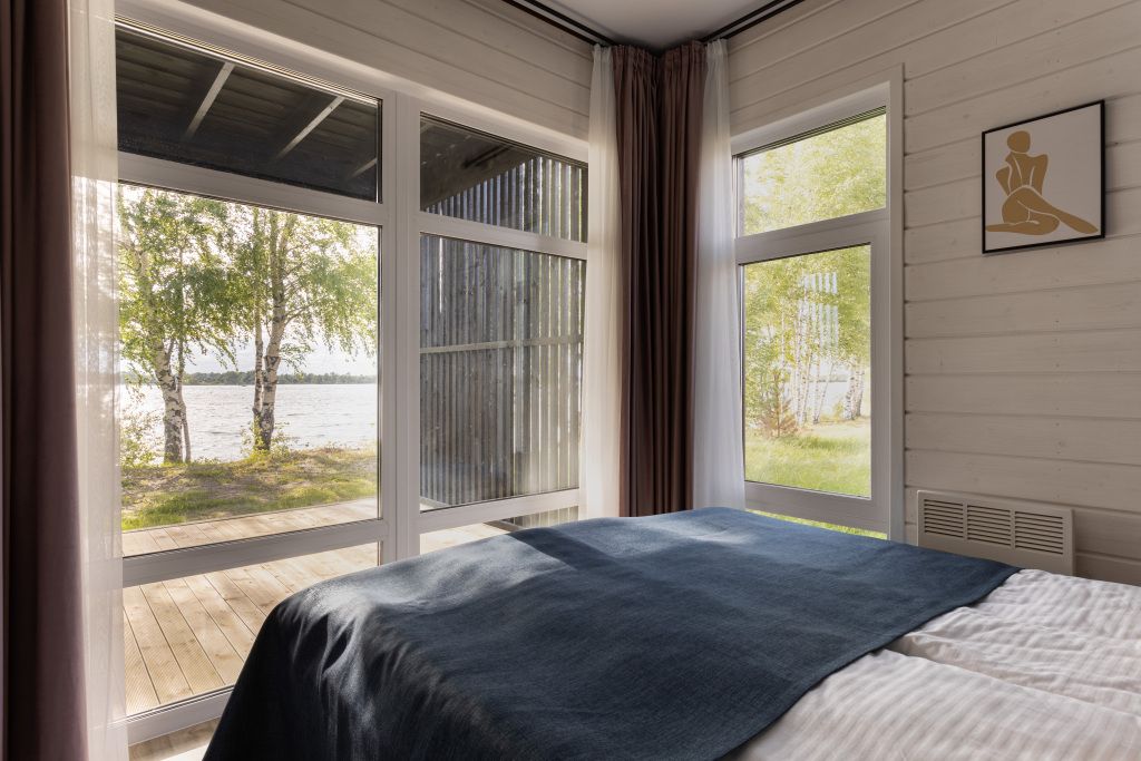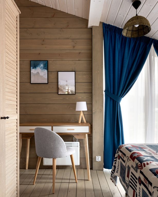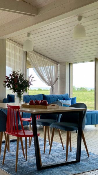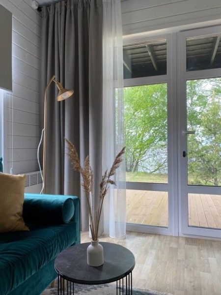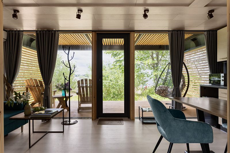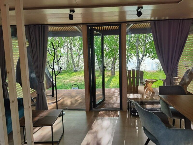 С собственной просторной террасы открывается вид на реку Сить, которая в этом месте превращается в море и достигает в ширину более 500 метров. Дизайнерское оформление в спальне выполнено в стиле Глэмпинг-шик, а в гостиной в спокойном скандинавском стиле.