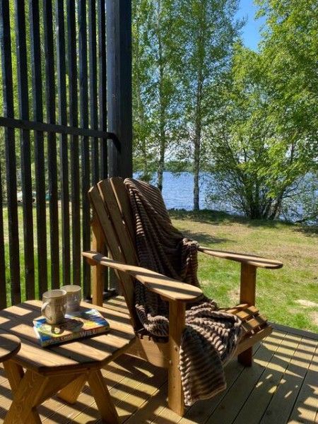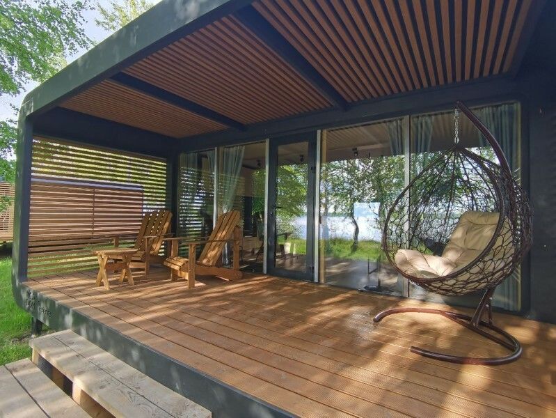 Современный лодж с отдельной спальней, просторной террасой и выходом на реку, расположенный на берегу реки.
