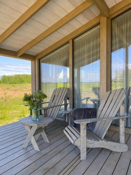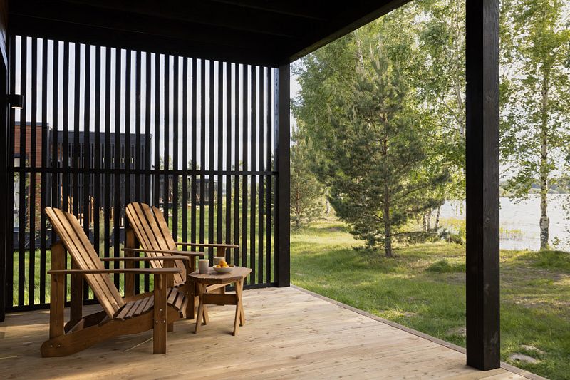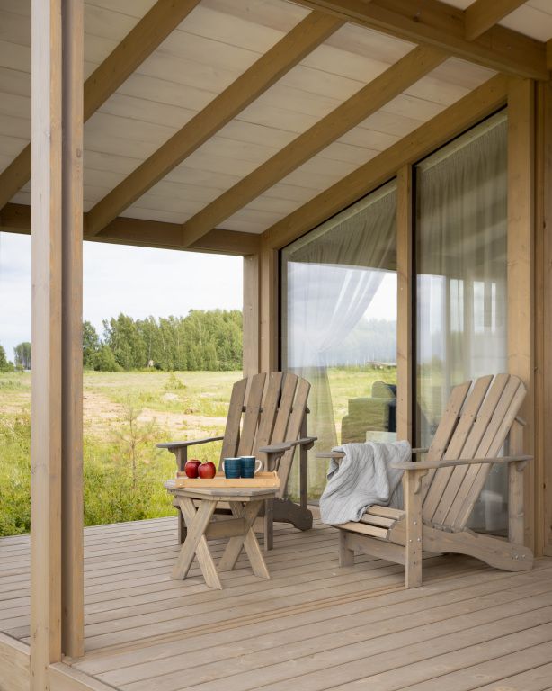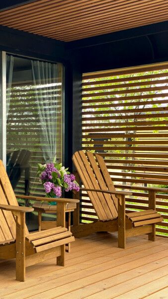 Деревянная терраса имеет навес, что позволит находиться на ней в любую погоду.