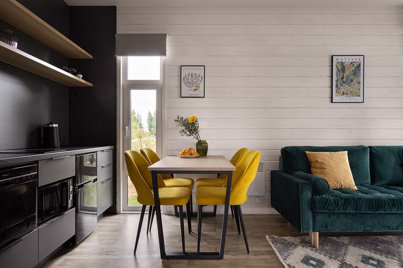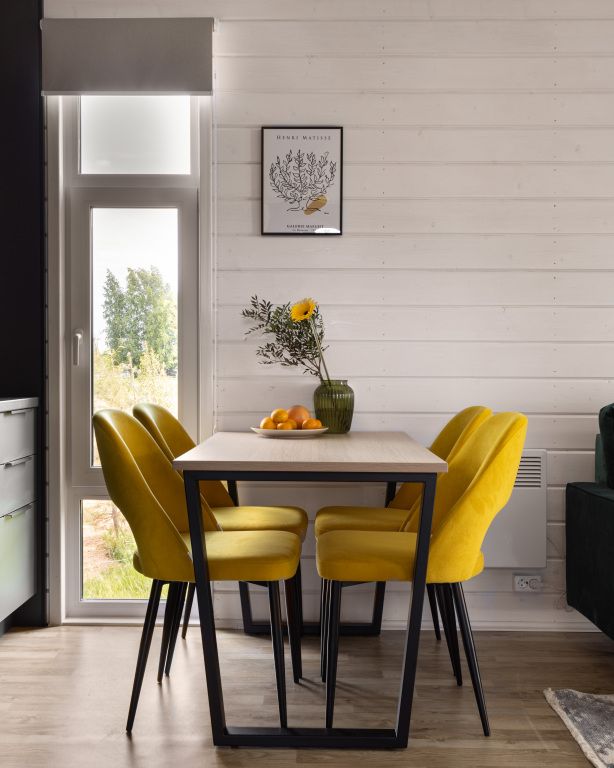 Для вашего удобства – обеденная зона со столом, креслами и раскладными стульями, журнальный столик, шкаф для одежды.