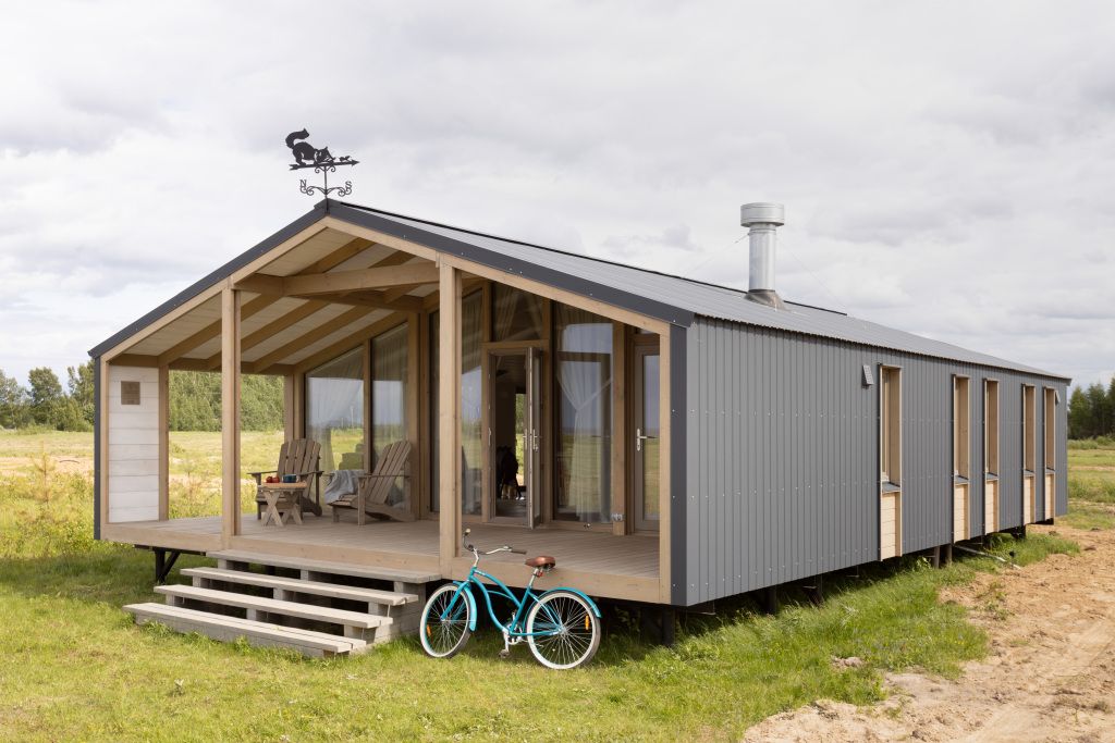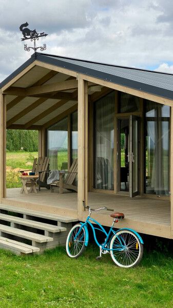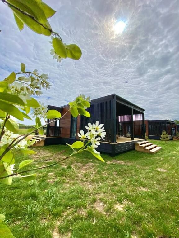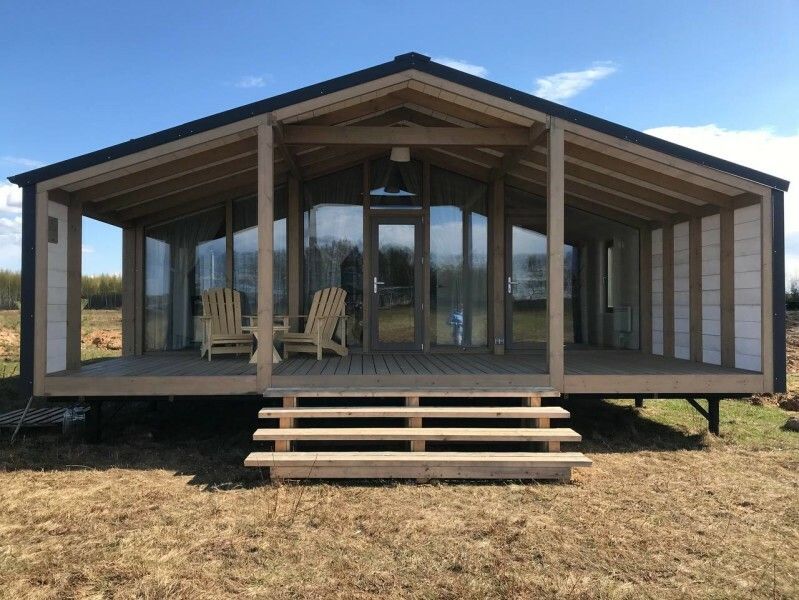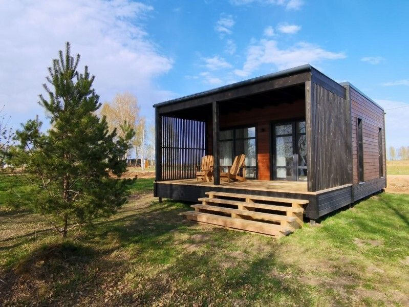 В мини-коттедже отделка выполнена из экологичного натурального дерева. Планировка: отдельный вход с тамбуром и шкафом для одежды и зеркалом, санузел с душевой, гостиная с кухней, спальня и крытая терраса.