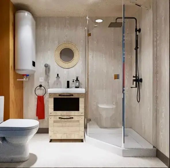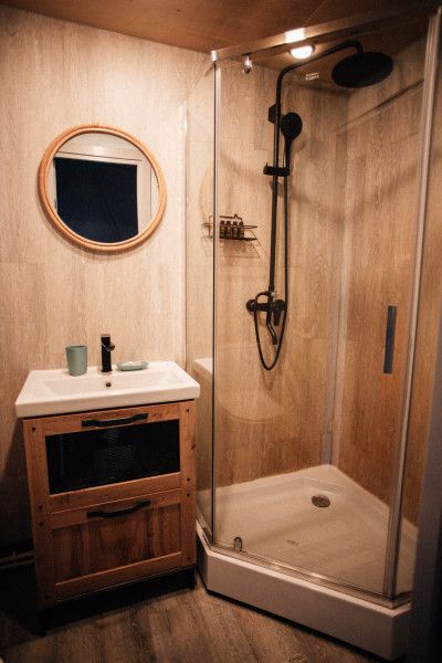 • Ванная комната с душевым уголком, феном и туалетно-косметическими принадлежностями.