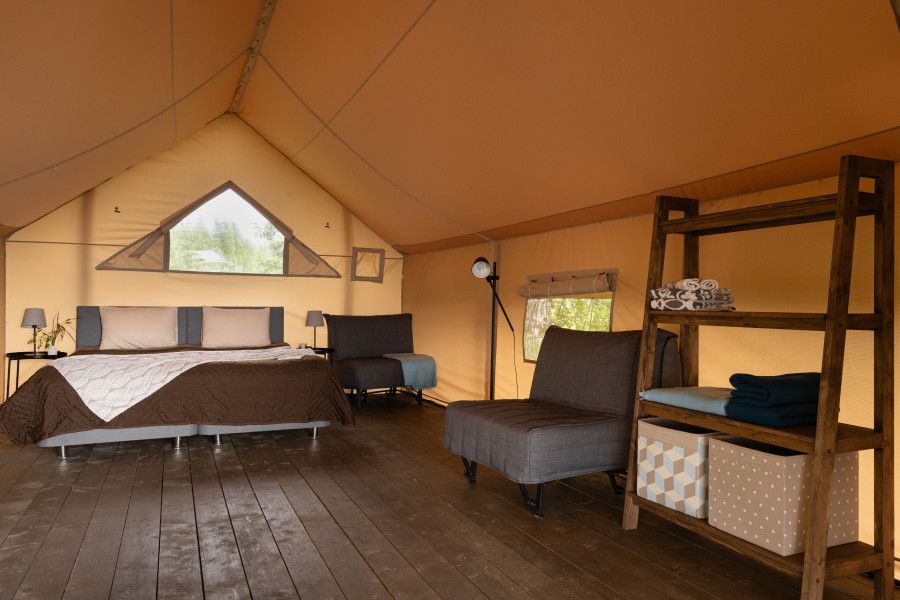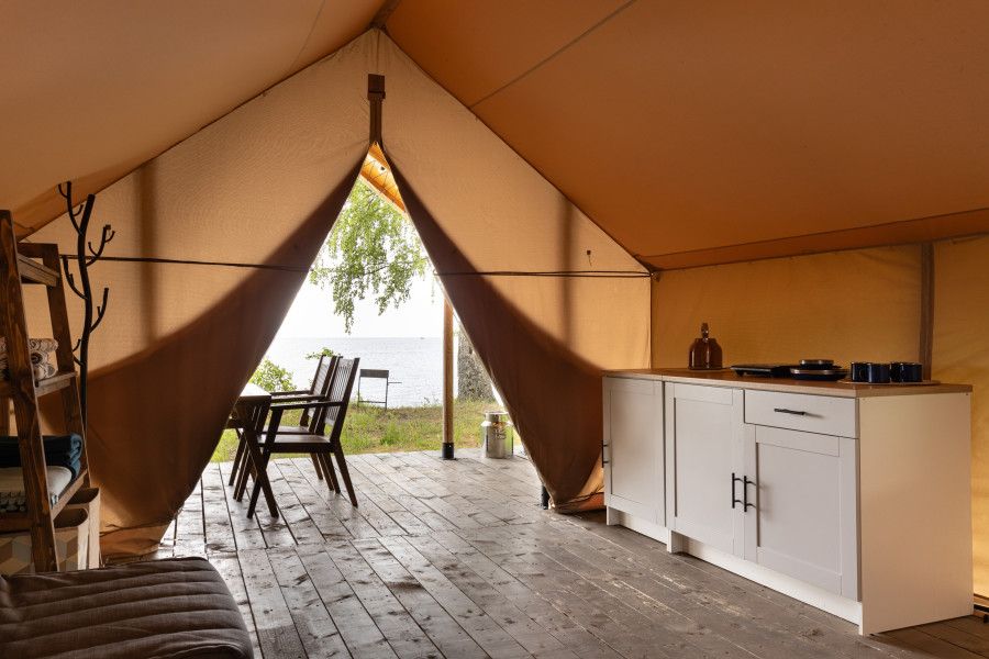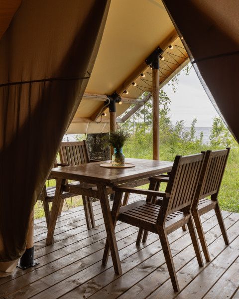 Сафари-тент с видом на море и просторной террасой в кемпинге «Морская гавань»