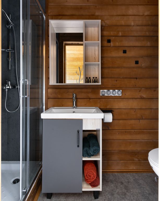 Внутри лоджа имеется собственный санузел (туалет, умывальник, душ), полноценная кухня (электрическая плита, посудомоечная машина, СВЧ, холодильник, чайник, посуда для сервировки и приготовления).