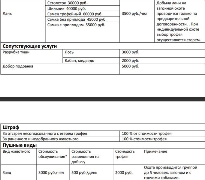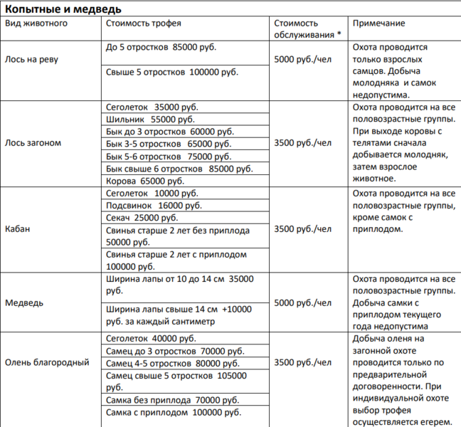 В стоимость обслуживания входит: составление необходимых документов, доставка к месту охоты и обратно на спецтехнике, егерское сопровождение, первичная обработка добытого трофея.