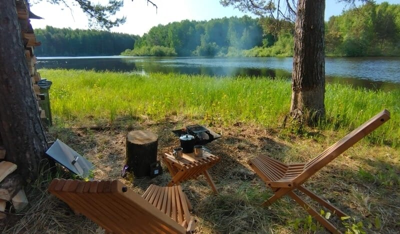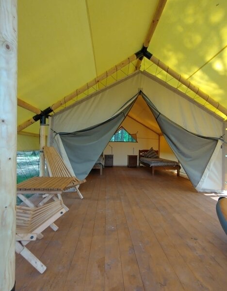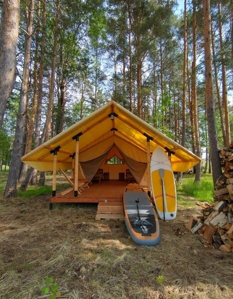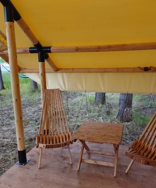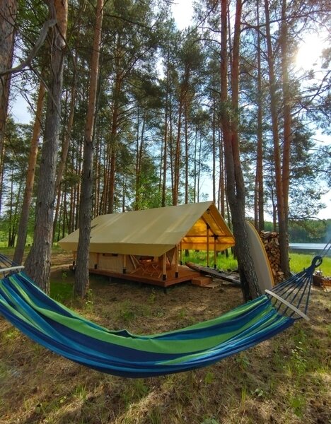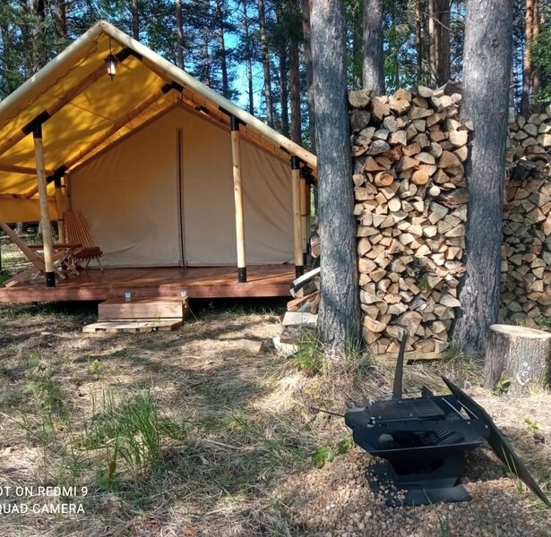 Уютные и основательные сафари–тенты на высокой дощатой основе с террасой, мангальной зоной, электричеством, умывальником, спуском к воде и общей костровой зоной доступны с мая по сентябрь.