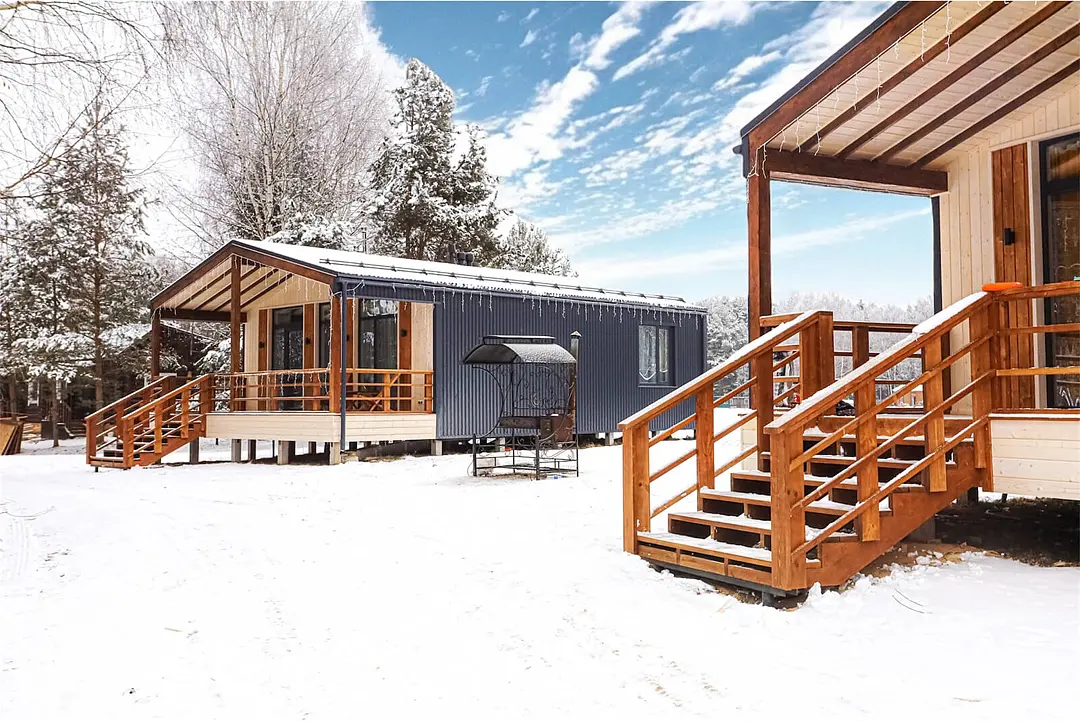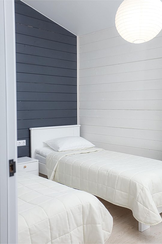 Современный дом с панорамными окнами, уютной гостиной и террасой с видом на пруд. Две отдельные спальни, каждая со своим санузлом, обеспечивают комфорт для компании до 4 человек.