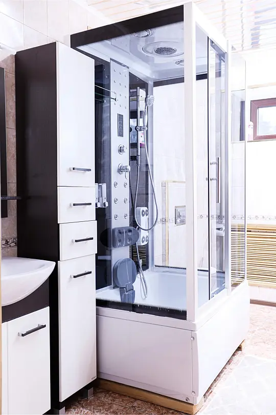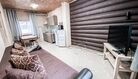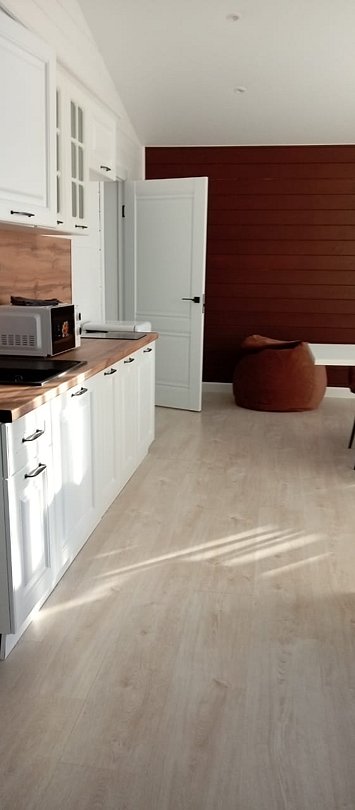 1 этаж: гостиная (мягкая мебель, обеденный стол, телевизор, кондиционер), мини-кухня (гарнитур, холодильник, микроволновая печь, чайник, посуда), ванная комната (душ, туалет).