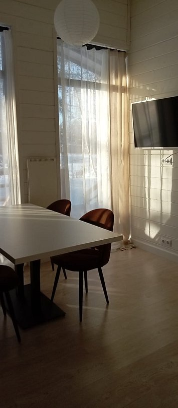 Это одноэтажный коттедж, состоящий из двух одинаковых половинок, каждая из которых может вместить до 5-и человек (4-основных места и 1 дополнительное). В каждой из половинок есть все для Вашего комфорта: кухня-гостиная (кухонный гарнитур, холодильник, микроволновая печь, чайник, набор посуды, диван-кровать, обеденная зона, телевизор), ванная комната (душ, туалет), две спальные комнаты (в в каждой по две односпальных кровати). Собственная парковка.