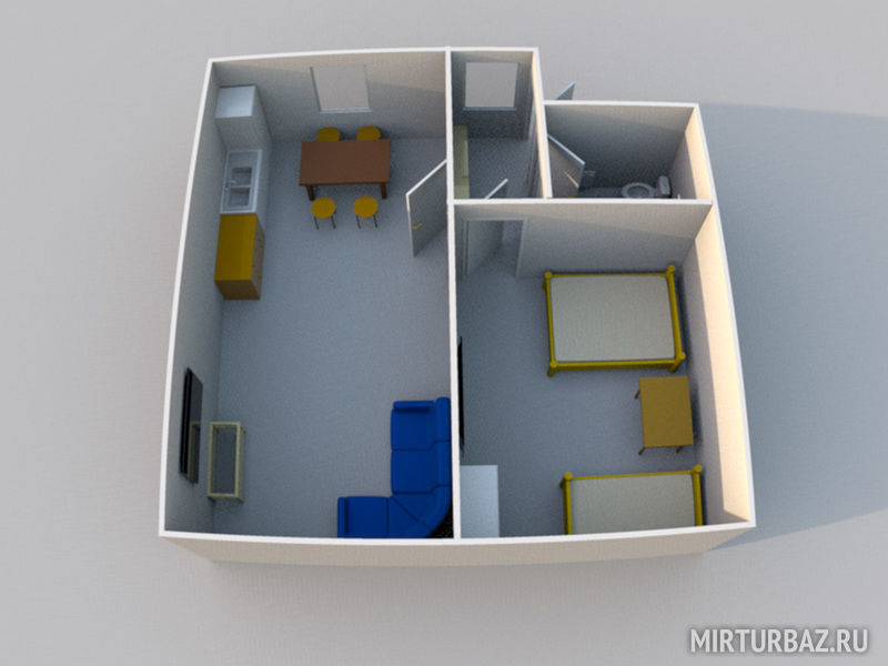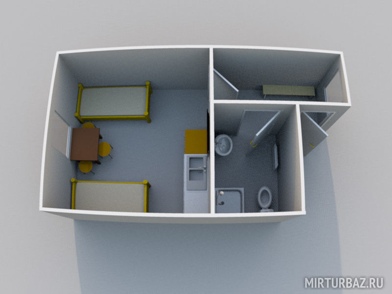 Однокомнатные номера рассчитаны на 2 постояльца, а двухкомнатные – на 5 постояльцев. Для комфортного проживания в номерах предусмотрена современная мебель, телевизор, санузел и душевая кабинка.