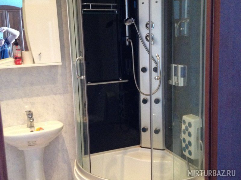 В номере: Две двуспальные кровати, диван раскладной, шкаф, стол, холодильник, плазменный телевизор, ТриколорТВ.