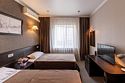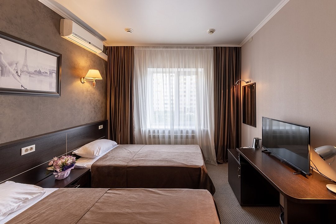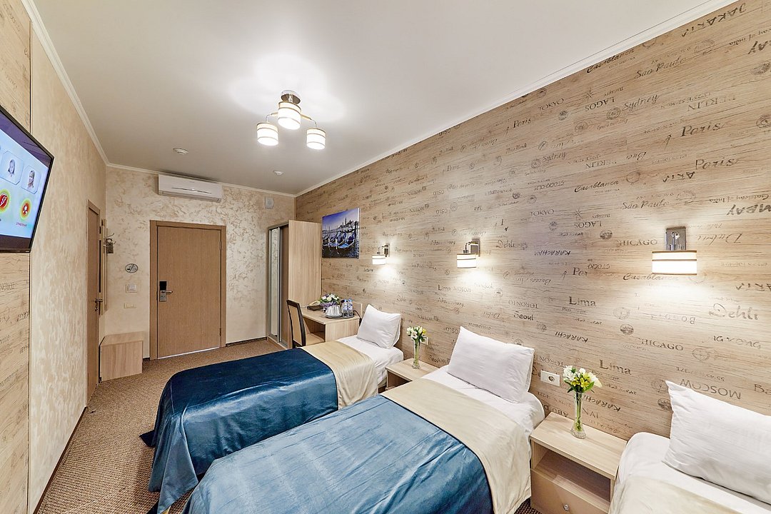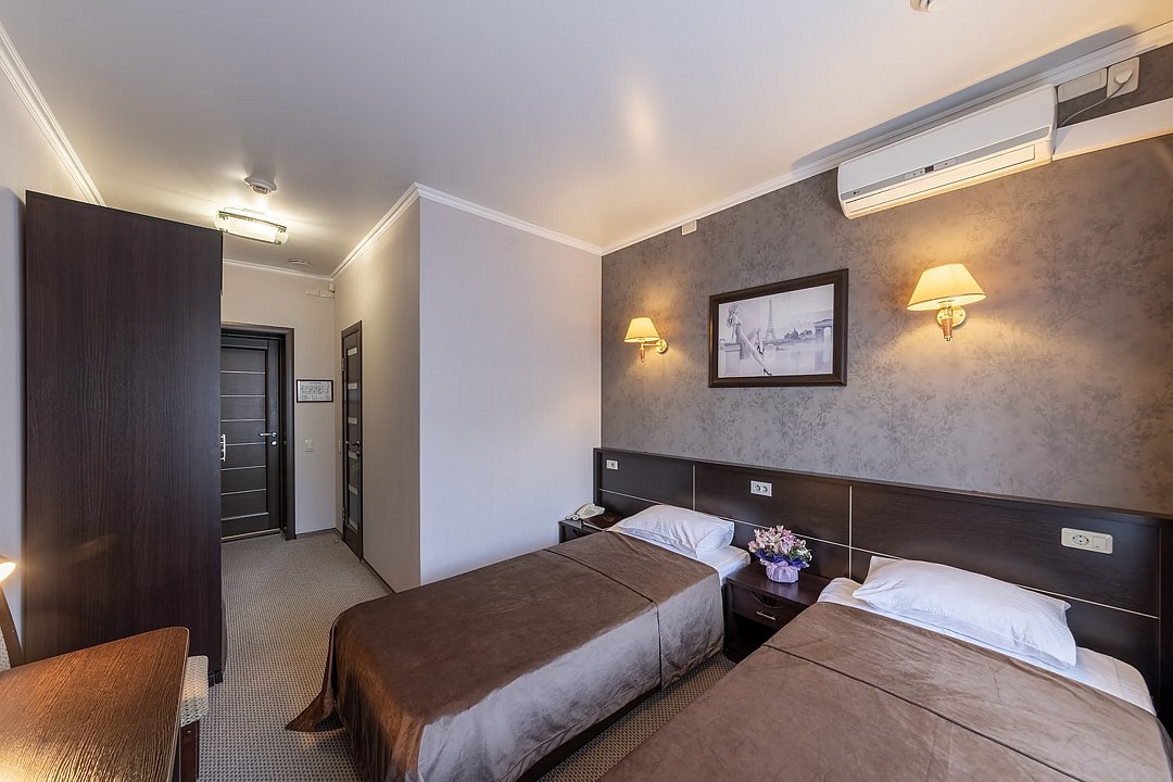 Оснащение номера включает две 1- спальные кровати, гардероб, ЖК-телевизор с широким выбором каналов, телефон, чайник, чай, питьевая вода, фен, посуда. Гостиничные номера включают ванную комнату, оборудованную душевой кабиной. Предоставляется комплект полотенец и парфюмерии индивидуального пользования.Услуги и удобства
