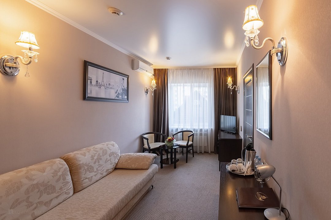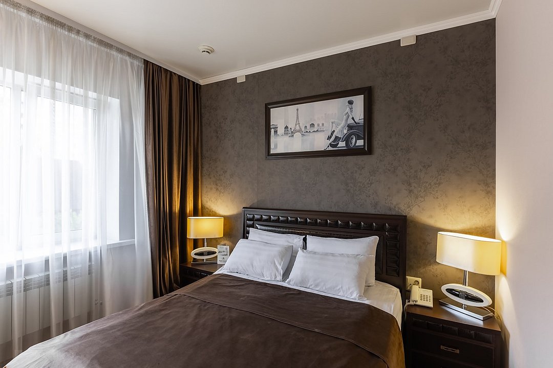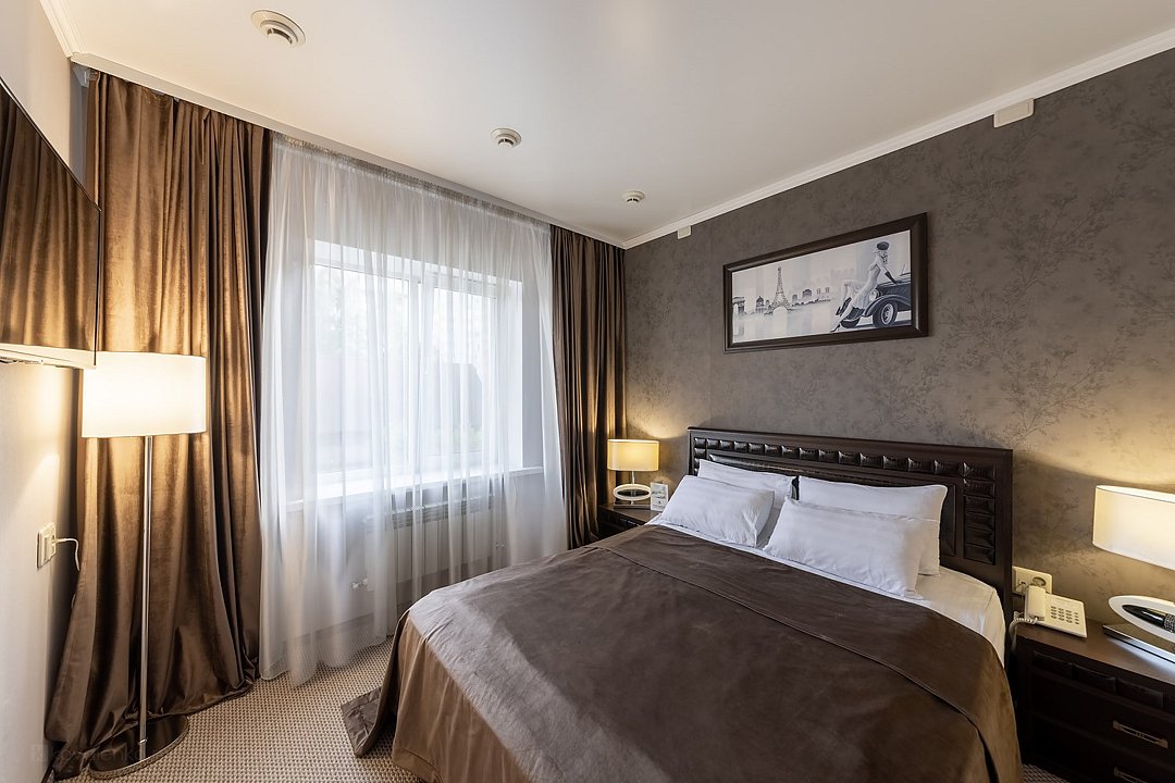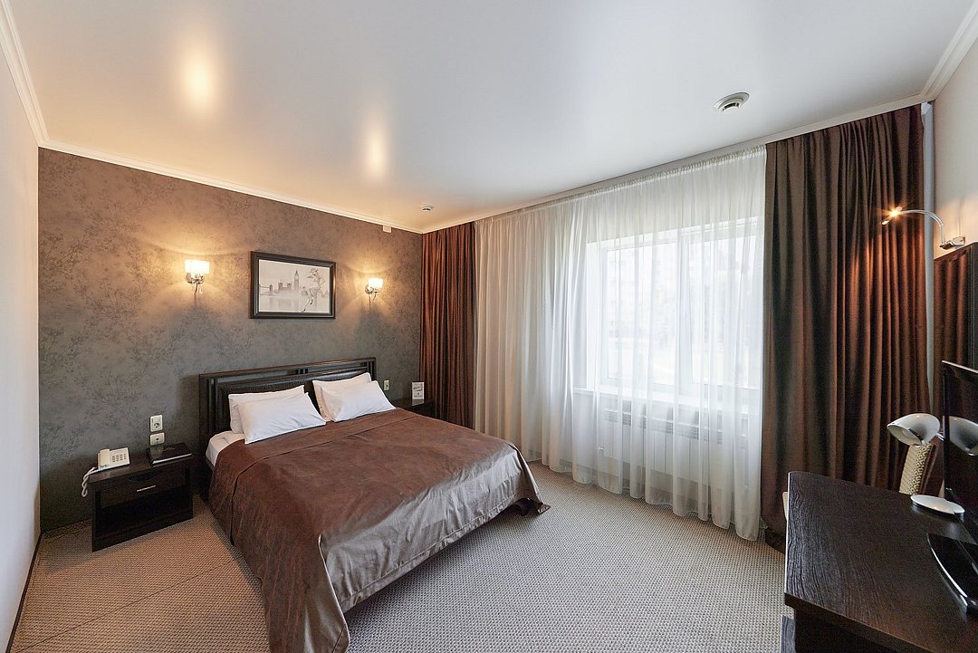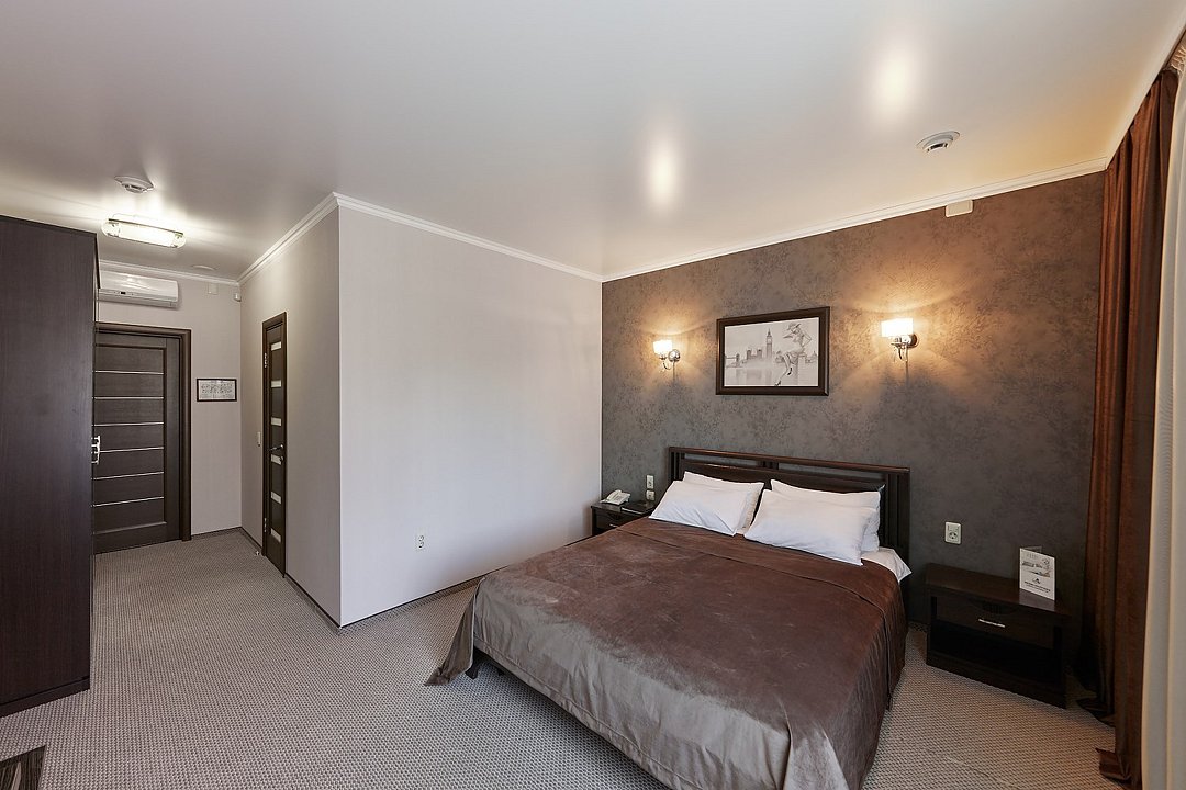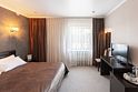 Очень просторный гостиничный номер "Business" с большой двуспальной кроватью, гардеробом, ЖК-телевизором, спутниковым TV, кондиционером, телефоном, необходимой посудой, холодильником, чайником, чаем, питьевой водой, феном, мини-баром. Ванная комната оснащена ванной. Предоставляется комплект полотенец, халат, тапочки и парфюмерия индивидуального пользования. В стоимость номера входят: возможность доступа к интернету через WI-FI – бесплатно, возможность пользования сейфом на ресепшен, круглосуточная охраняемая стоянка.Услуги и удобства