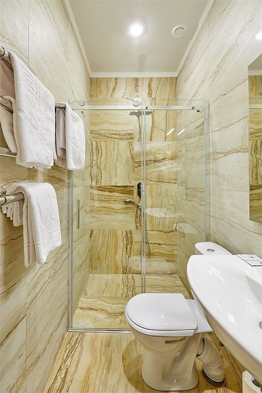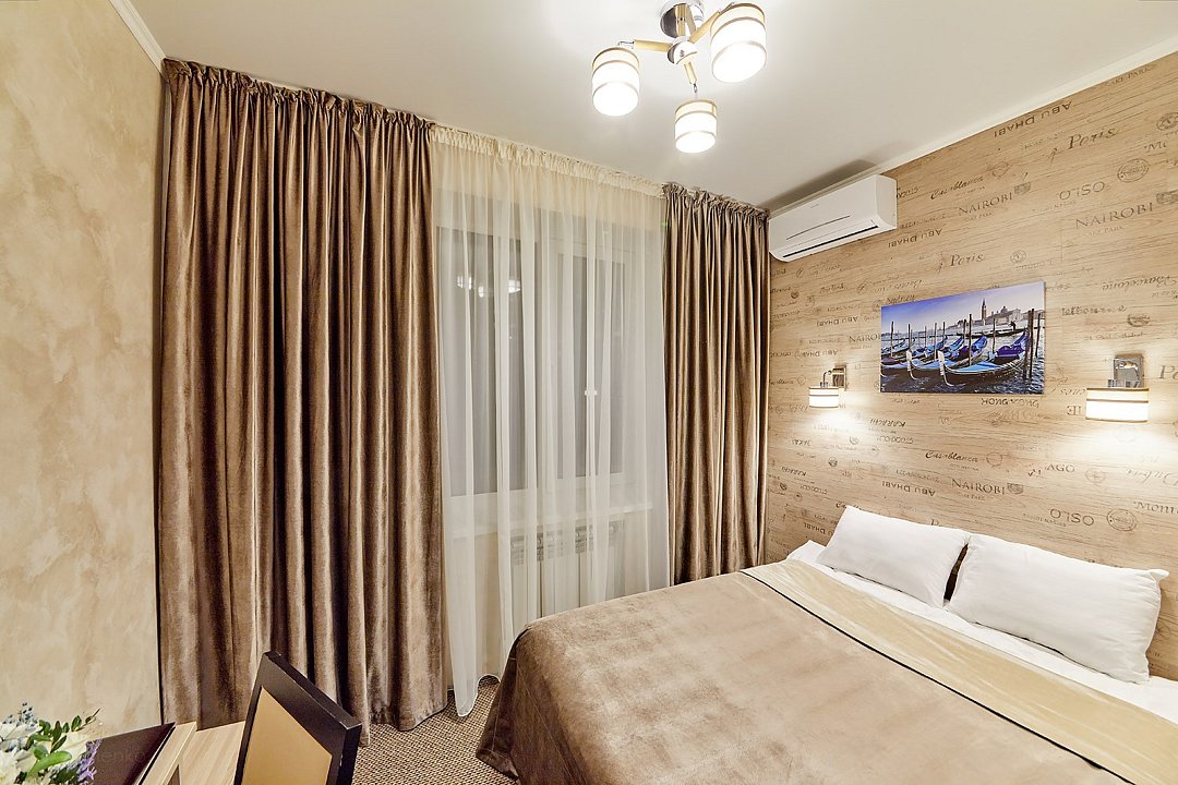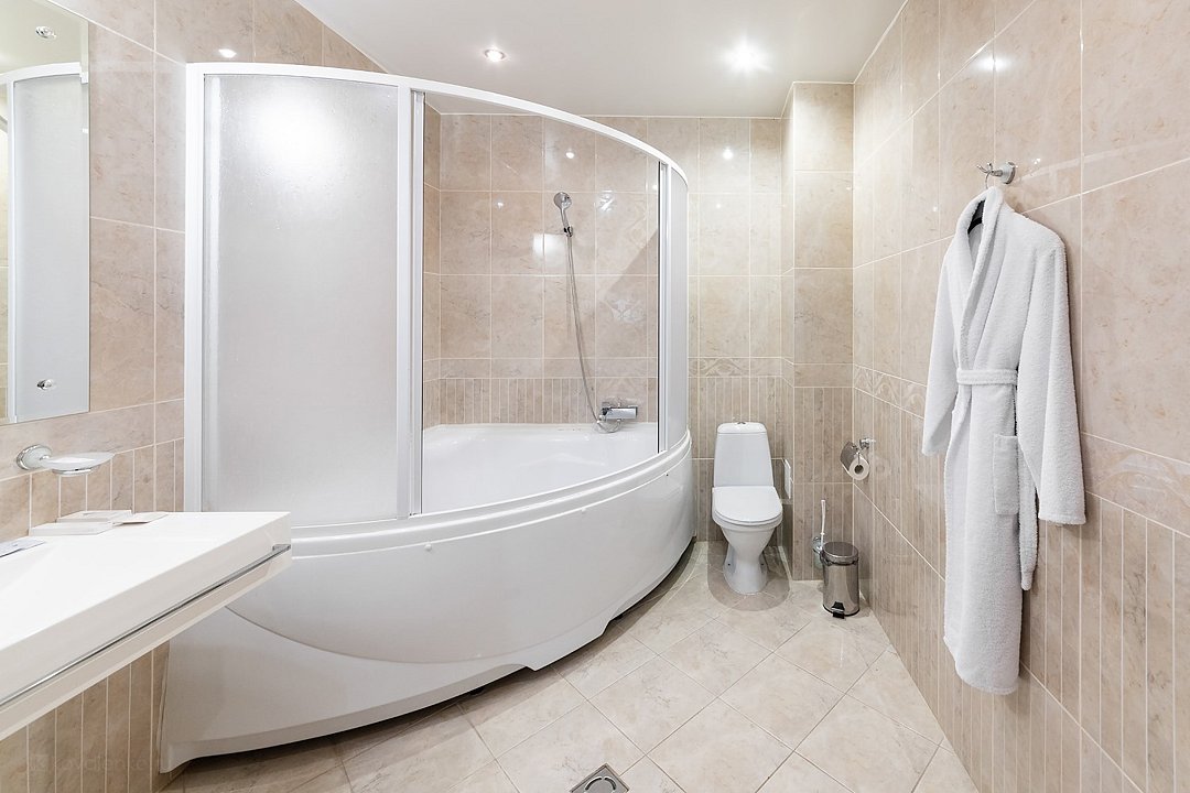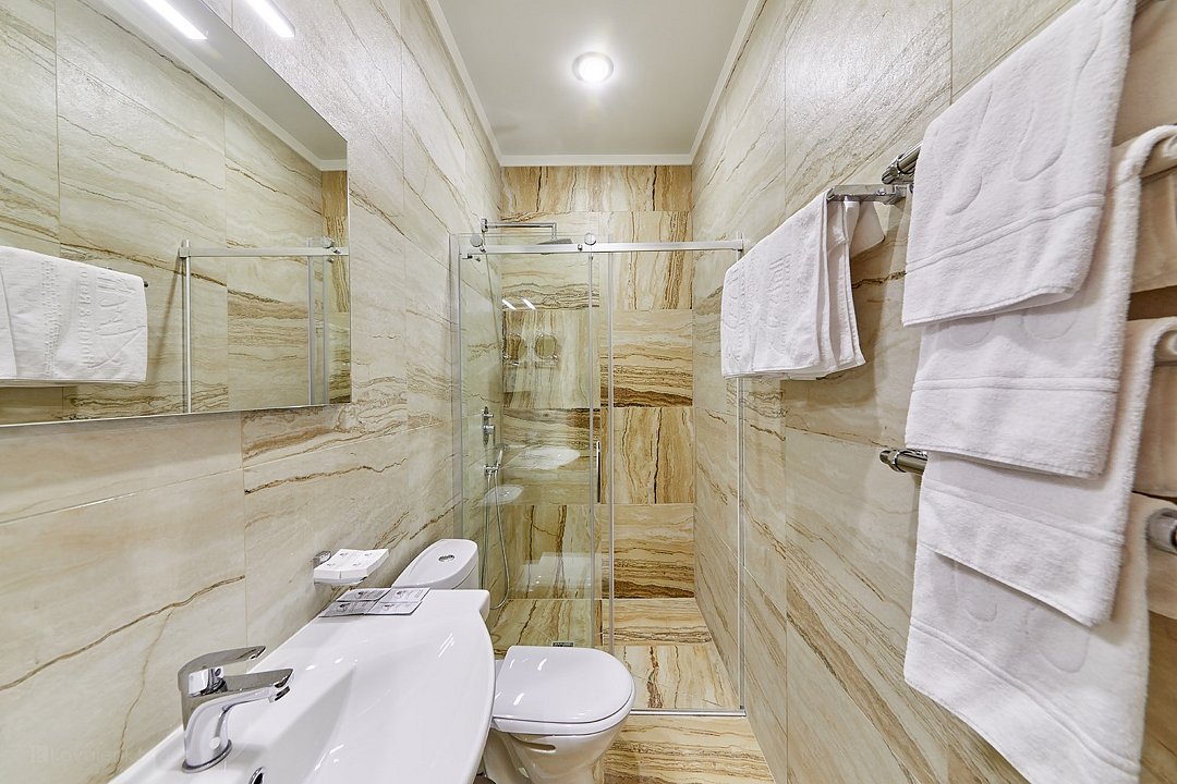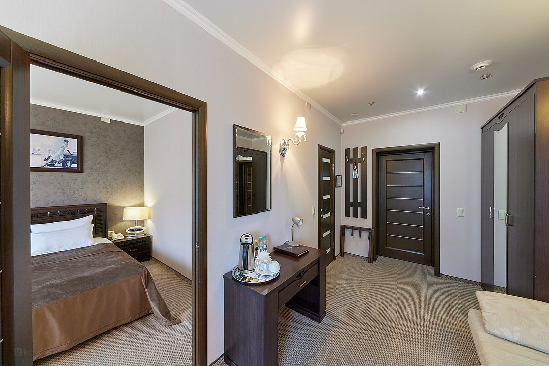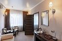 Очень просторный гостиничный номер "Business" с большой двуспальной кроватью, гардеробом, ЖК-телевизором, спутниковым TV, кондиционером, телефоном, необходимой посудой, холодильником, чайником, чаем, питьевой водой, феном, мини-баром. Ванная комната оснащена ванной. Предоставляется комплект полотенец, халат, тапочки и парфюмерия индивидуального пользования. В стоимость номера входят: возможность доступа к интернету через WI-FI – бесплатно, возможность пользования сейфом на ресепшен, круглосуточная охраняемая стоянка.Услуги и удобства