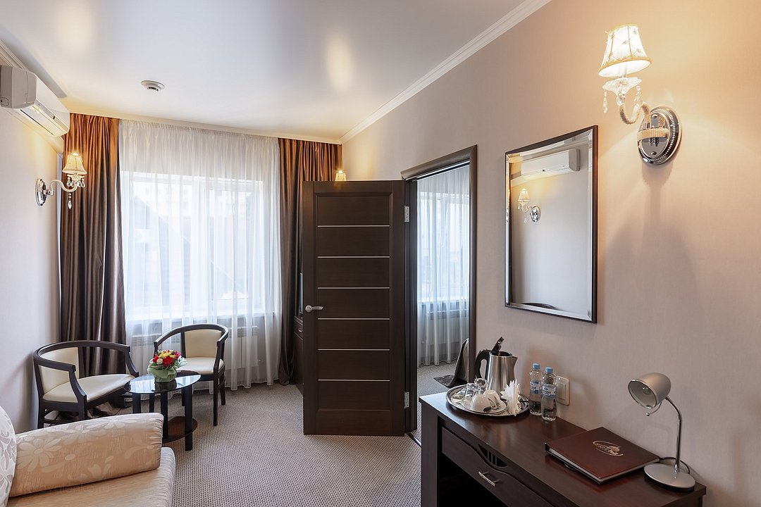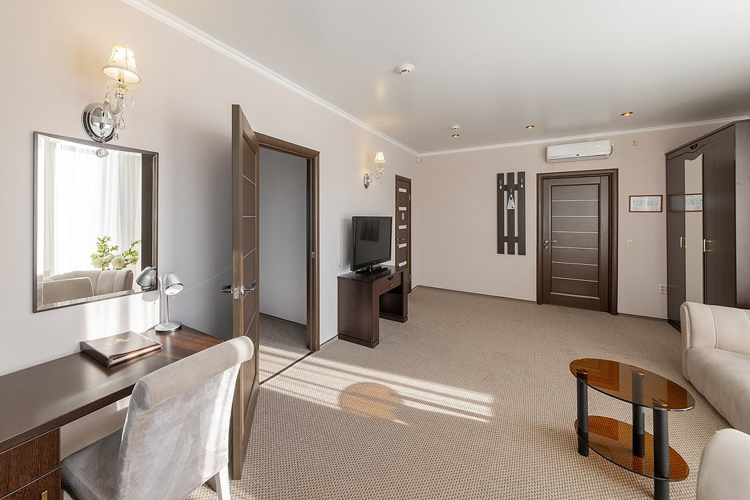 Состоящий из двух комнат номер "Люкс" располагает всем необходимым для комфортного отдыха. В спальной комнате имеется удобная двуспальная кровать, в гостевой комнате мягкая мебель. WiFi - бесплатно, круглосуточная охраняемая стоянка. Комната отдыха оборудована гардеробом, дополнительной софой, ЖК-телевизором со спутниковым TV. Так же к вашим услугам электрический чайник,чай, питьевая вода, телефон, фен, кондиционер, холодильник, сейф, мини-бар, посуда. Ванная комната оснащена ванной. Предоставляются халаты, тапочки,комплект полотенец и парфюмерия индивидуального пользования.Услуги и удобства